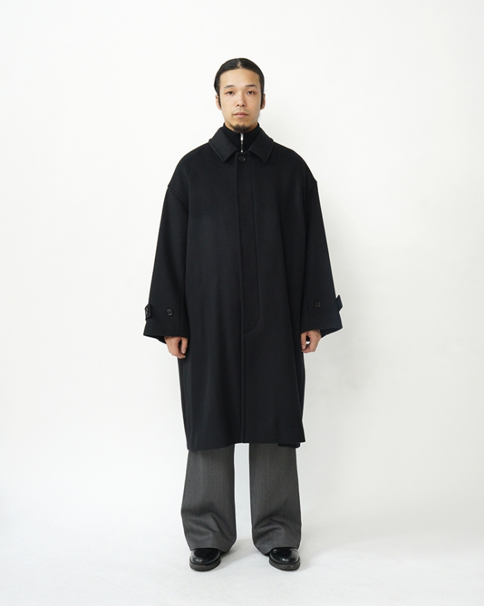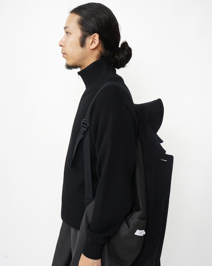 着てる中でも背負っておいて、袖を外すだけで、脱ぎ着ができるというコートになってますね。
