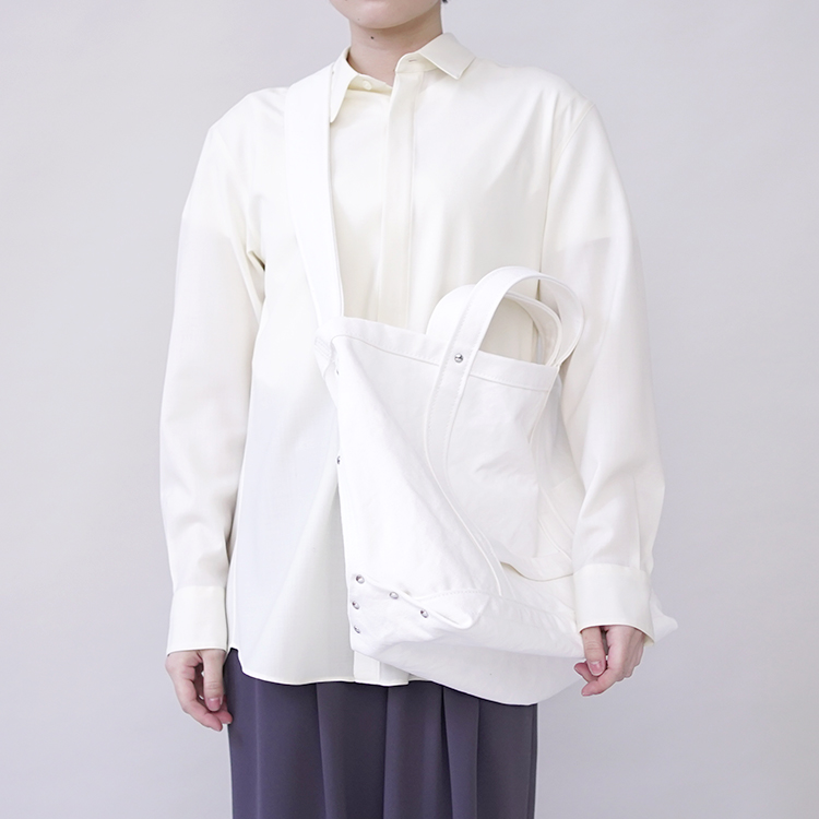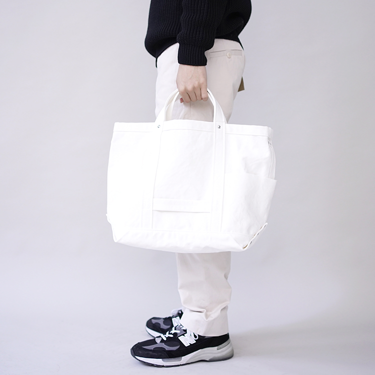 英国の庭師の使うバッグをイメージして製作された、手持ちと肩掛けの2way仕様のバッグです。使い込むごとに経年変化を楽しめる厚手のコットンキャンバス素材を使用しています。中底にはナイロン素材の生地を当てることで防水性を持たせ、負荷の強くかかるマチ部分にはリベットで補強がなされています。また内外三カ所に配置されたポケットには小物やペットボトル等を収納可能です。