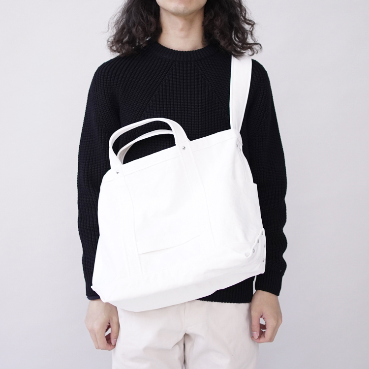 使い込むごとに経年変化を楽しめる厚手のコットンキャンバス素材を使用しています。中底にはナイロン素材の生地を当てることで防水性を持たせ、負荷の強くかかるマチ部分にはリベットで補強がなされています。また内外三カ所に配置されたポケットには小物やペットボトル等を収納可能です。