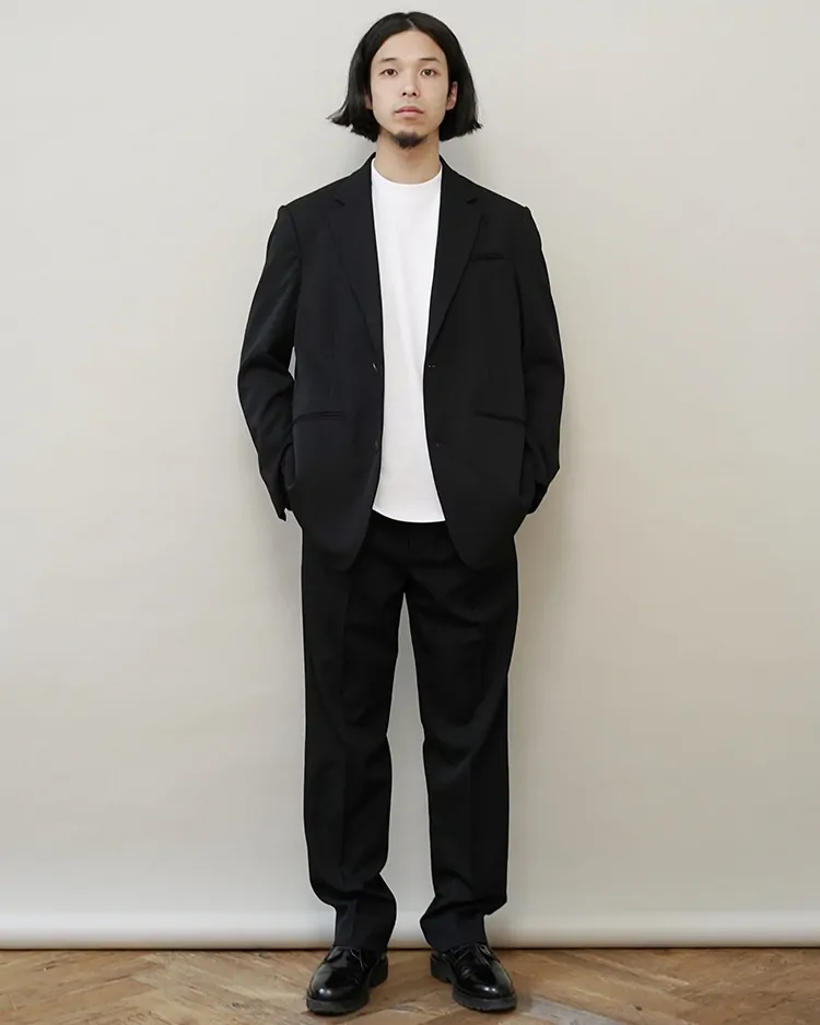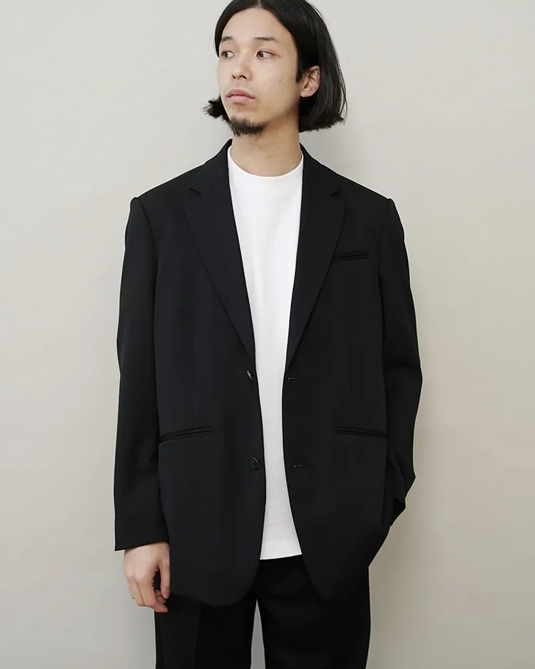 クラシックとモード、フォーマルとカジュアルが融和するスタンダードを模索した、ダイスアンドダイスが提案するスーツスタイルのテーラードジャケット。生地は尾州で生産されるスーパー100sウールの糸を使用したウールギャバジン生地を採用。後見頃に対して前裾がやや長い前下がりのデザインで、正装として着用ができるクラシックさを保ちつつ、野暮ったくない現代的な印象に仕立てました。低めの2つボタンで品のあるシャープなVゾーンに。薄くパッドの入ったナチュラルショルダー。フロントダーツや前振り袖など、テーラードならではの体を包む立体的なつくりです。飾りのないフラットなホーンボタンを使用するなど、可能な限り装飾的な要素を排した普遍的なデザインを目指しました。