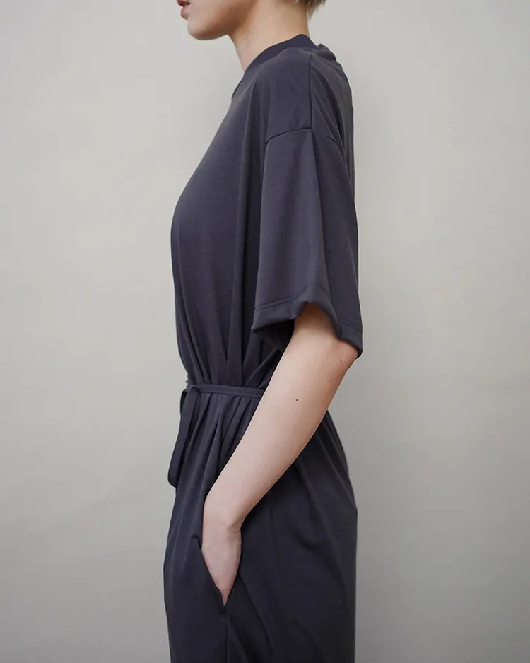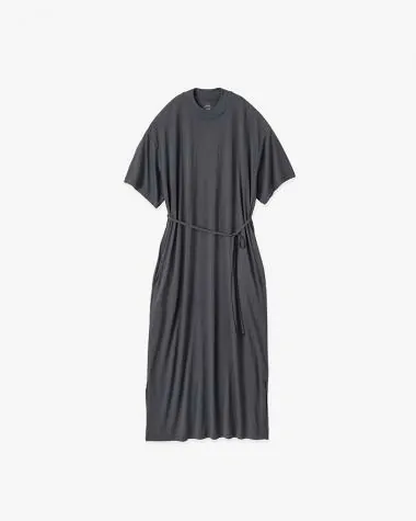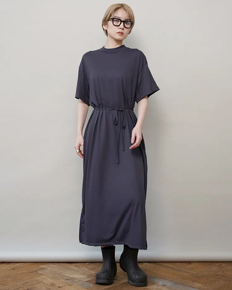 耐久性に優れたコーデュラナイロンに良質なウールを混紡した別注糸を36Gという非常にハイゲージで編み立てたジャージ素材。引き裂きに強く毛玉になりにくい、防縮加工によるイージーケアも嬉しいデイリーに着用出来る仕上がり。ウエストにベルト紐付きでブラウジングしたり、後ろで結んだりとアレンジが可能なモックネックのドレス。便利なサイドポケット付き。