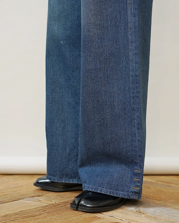 日本製のオーガニックコットン100%生地を使い、ヒゲを入れず、スリのみを入れたクリーンなデニムの表情は、一本一本、職人の手で加工されています。