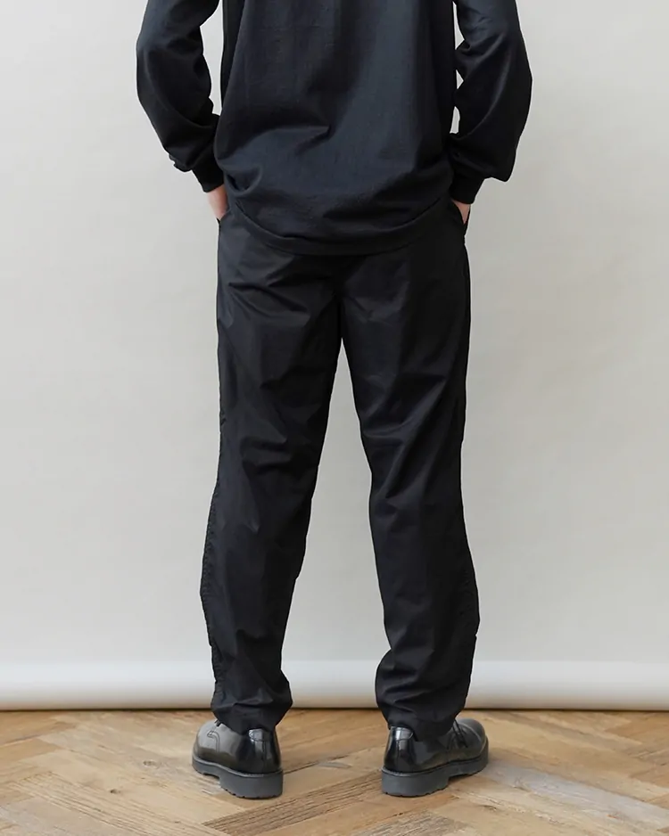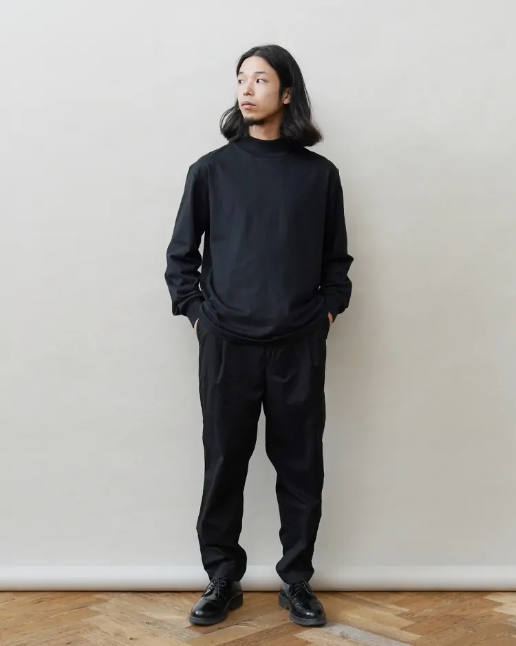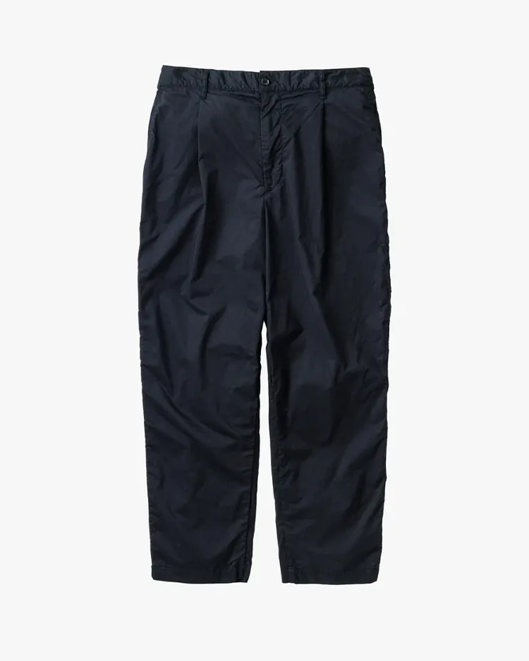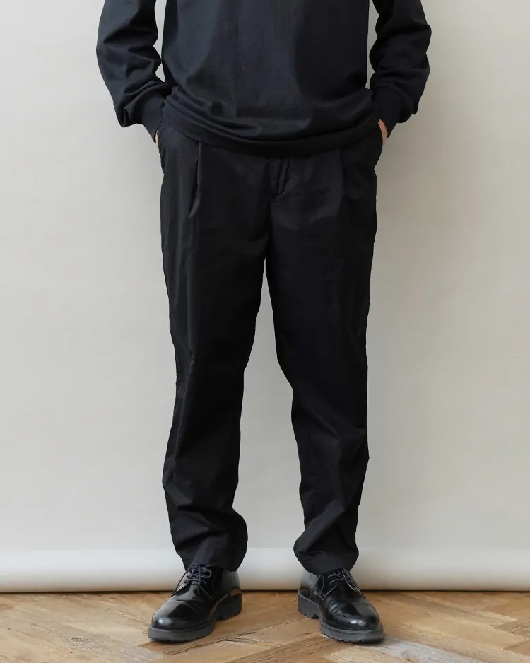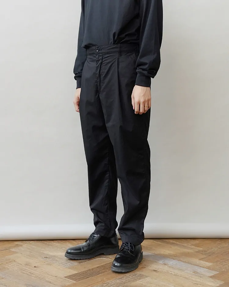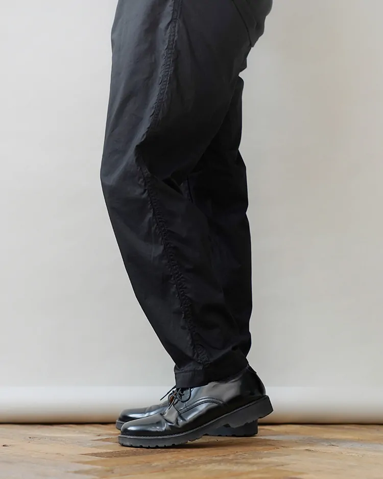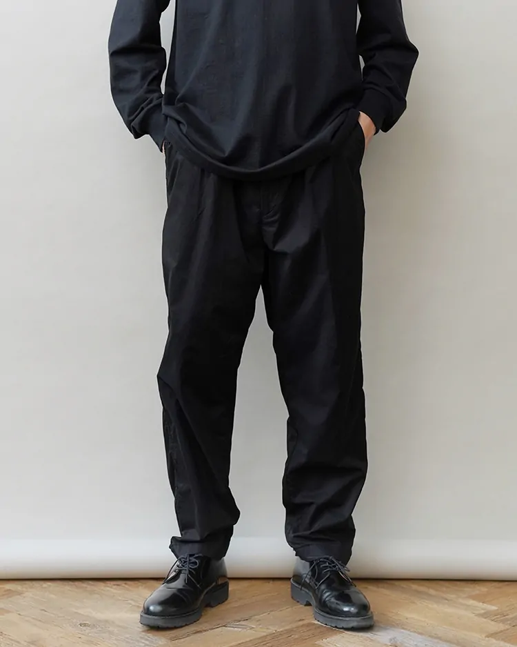 非常に繊細でありながら高密度に織り上げることで滑らかな肌触りと程よいハリ感が特徴のコットンタイプライター。その生地を表裏ともに使用した無双仕立てのトラウザー。太番手の糸で巻き縫いし、製品染めをすることで縮みによる独特な風合いが特徴で裾に向かって緩やかにテーパードしたシルエット。ウエスト後ろ側にゴムを入れたイージーフィット。