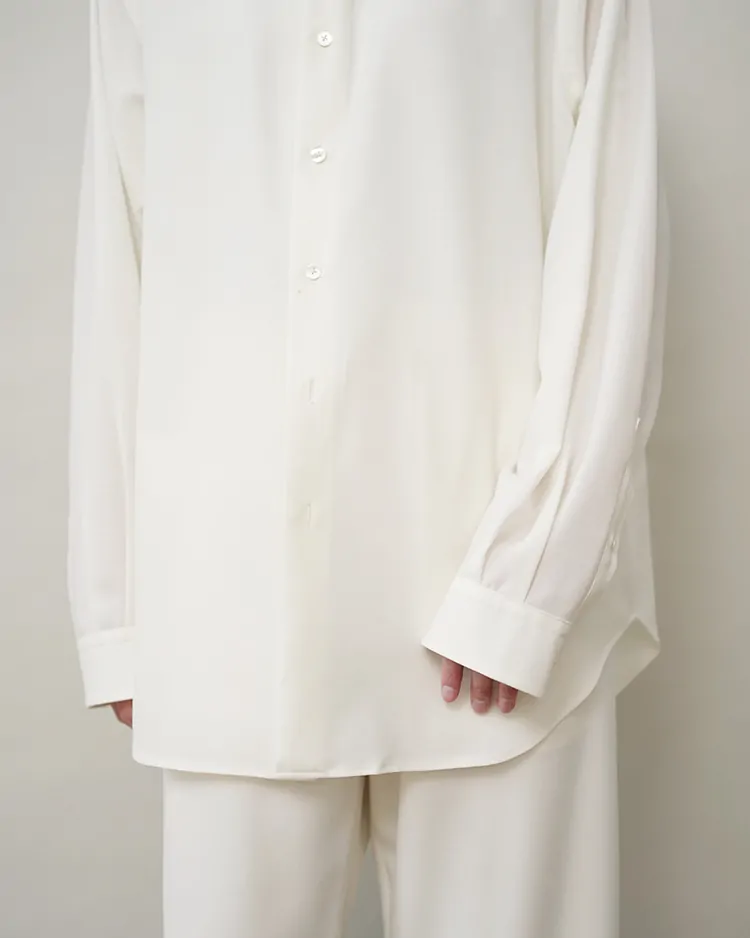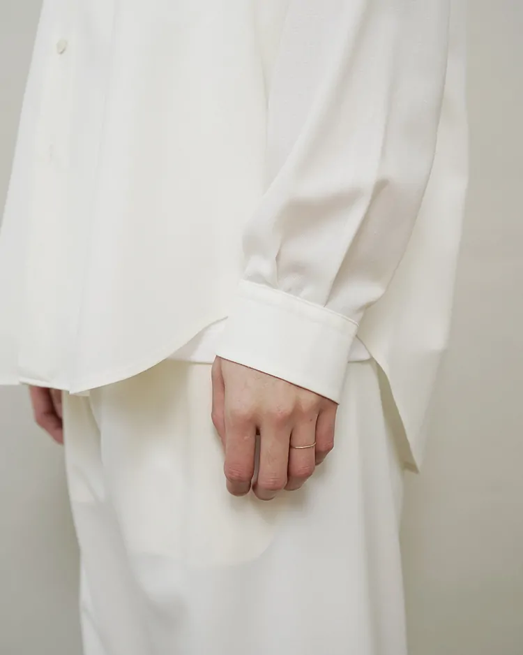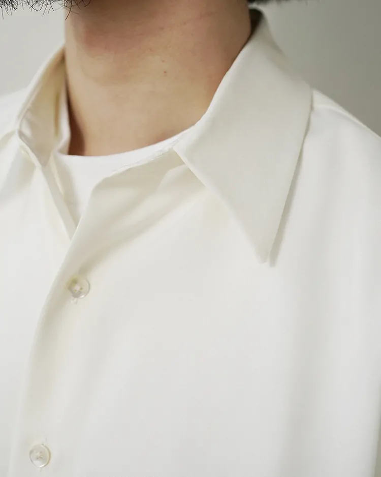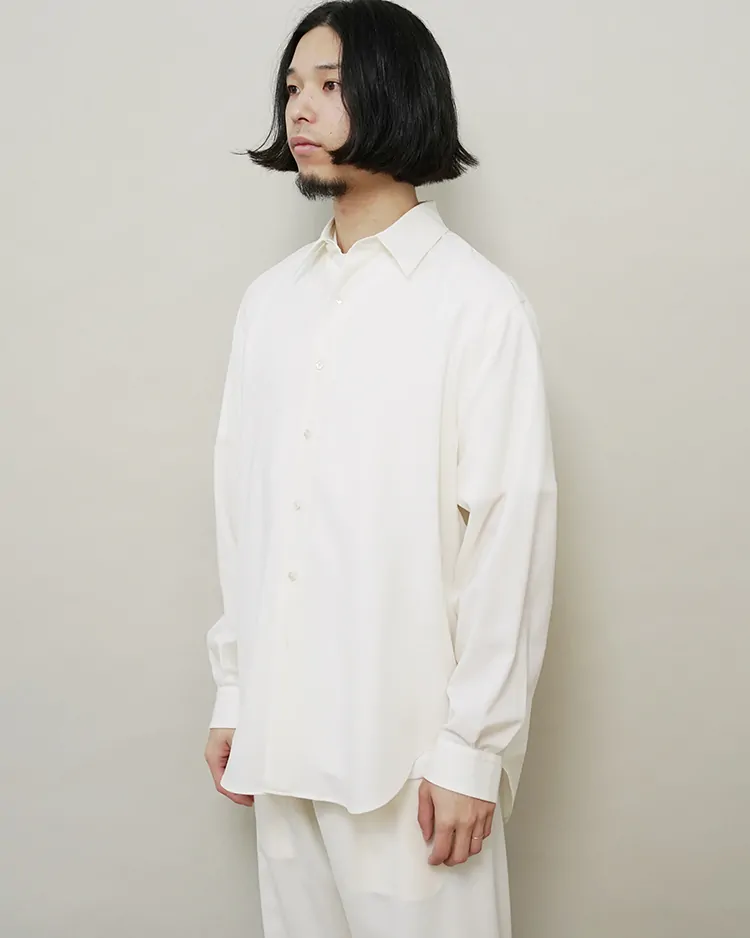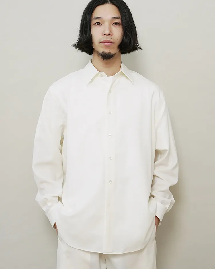 場所やシーズンを選ばず、イージーケアでいつも品よく着られるボタンシャツを目指しました。生地は尾州で生産されるトロピカルウール生地を採用。身幅を広くとったクラシックなスタイルがベースのシルエットで、肩まわりが動かしやすく、軽やかな生地のドレープを感じられる深めのサイドタックを施しました。美しい生地を活かす細かな運針。装飾の無いフラットな蝶貝ボタンを使用するなど、可能な限り装飾的な要素を排したデザインです。