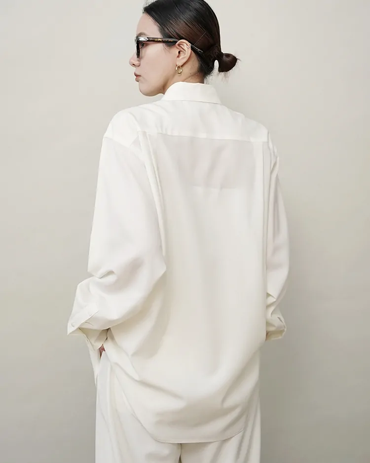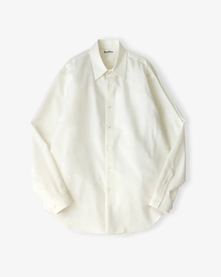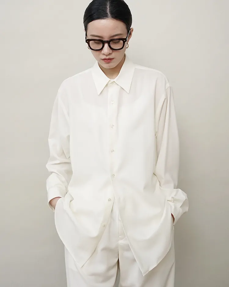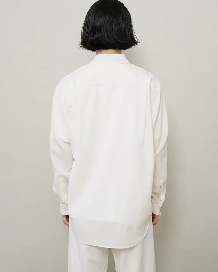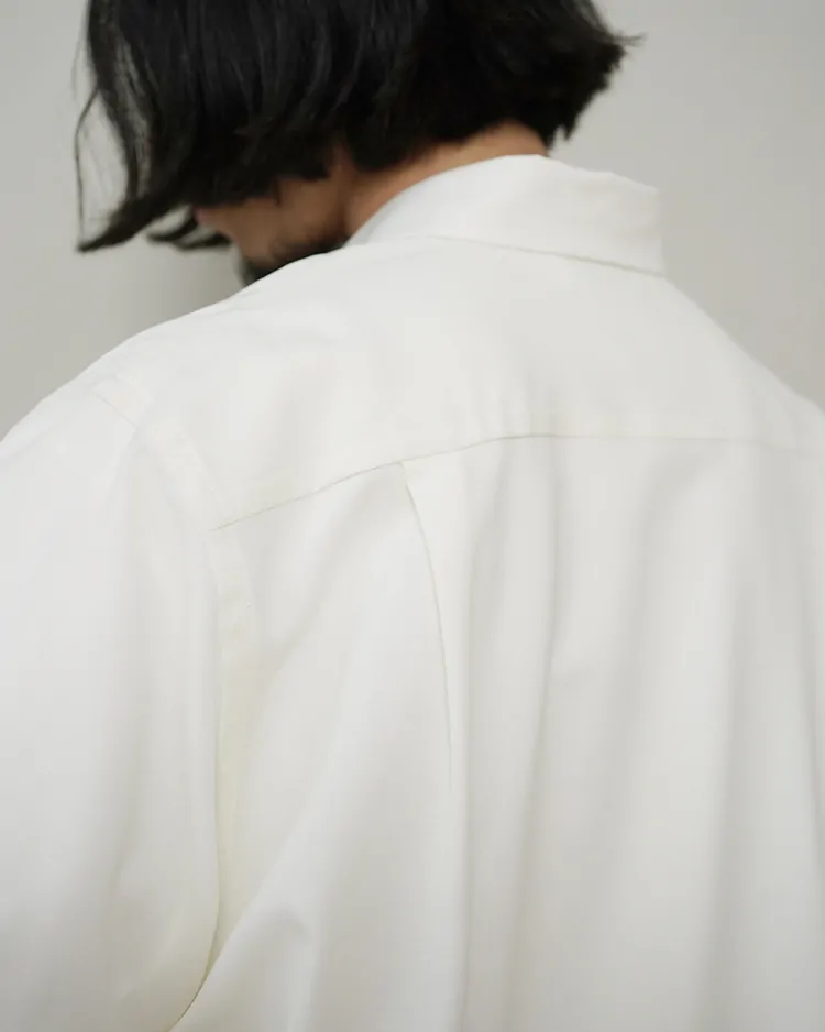 場所やシーズンを選ばず、イージーケアでいつも品よく着られるボタンシャツを目指しました。生地は尾州で生産されるトロピカルウール生地を採用。身幅を広くとったクラシックなスタイルがベースのシルエットで、肩まわりが動かしやすく、軽やかな生地のドレープを感じられる深めのサイドタックを施しました。美しい生地を活かす細かな運針。装飾の無いフラットな蝶貝ボタンを使用するなど、可能な限り装飾的な要素を排したデザインです。