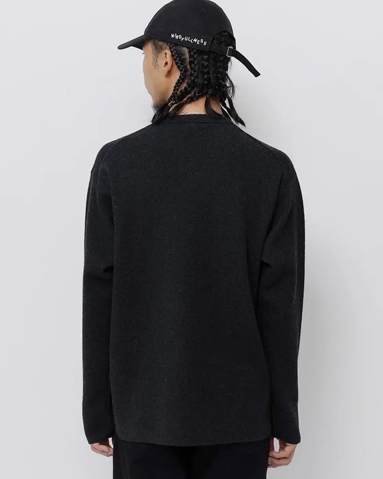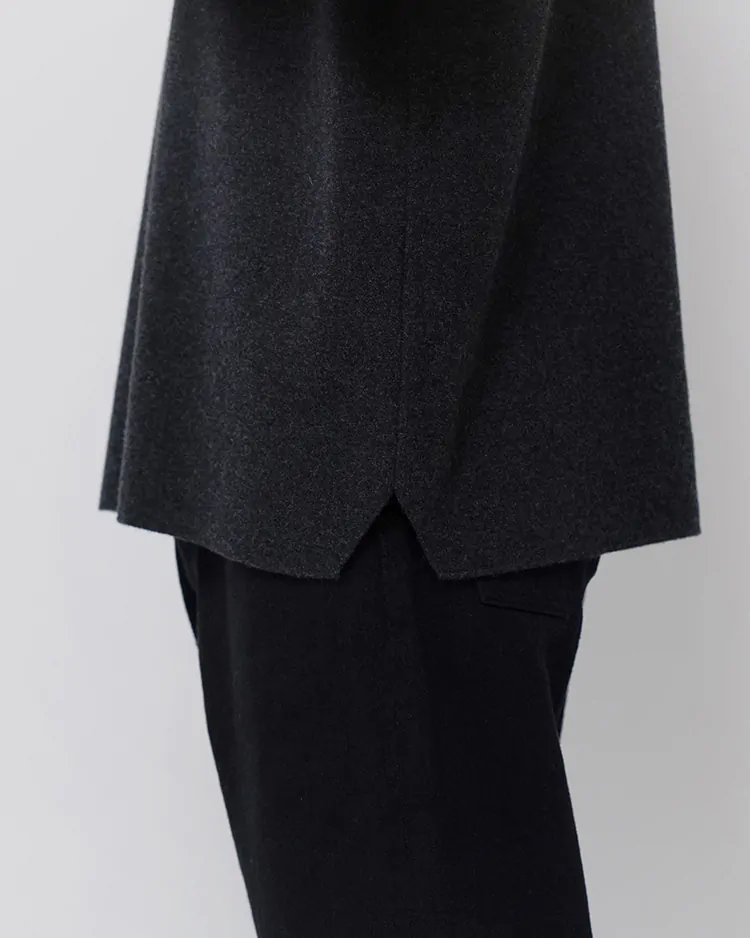 職人の手作業によるリンキング縫製を使い、ニットならではの伸縮性、減らし目の技術を使ったスリットなど、随所にこだわった作りながら、リラックスした着心地を目指した一着。
