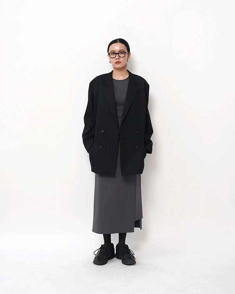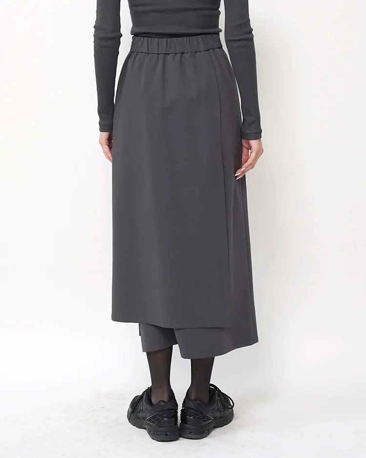 布帛のように見える、縦横にストレッチ性のあるハイゲージのポンチ素材。定評のあるラップデザインのロングスカートがアップデート。フロントベルトはきっちと魅せながら後ろベルトにゴムを配してイージーなフィット感を。縦横に伸びるためストレスのない着心地を実現。