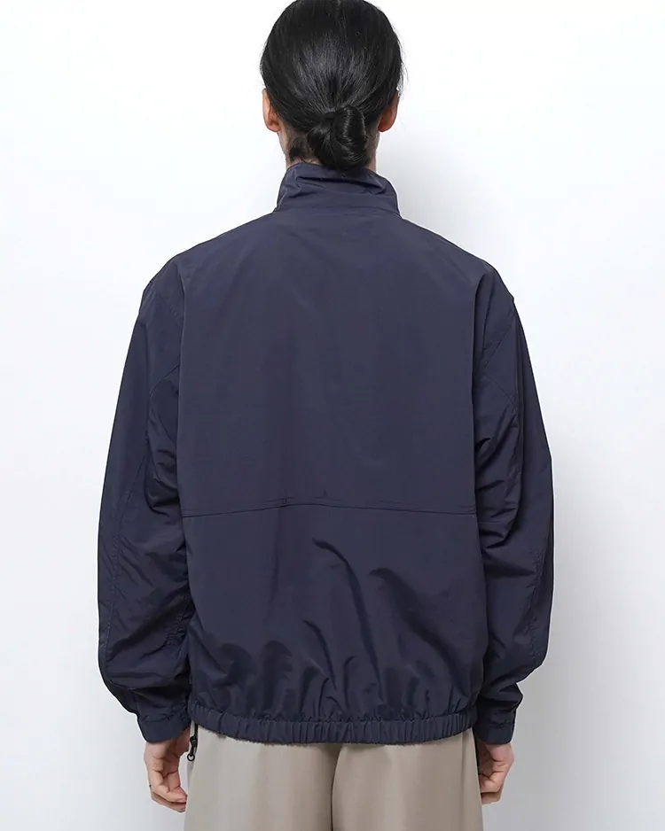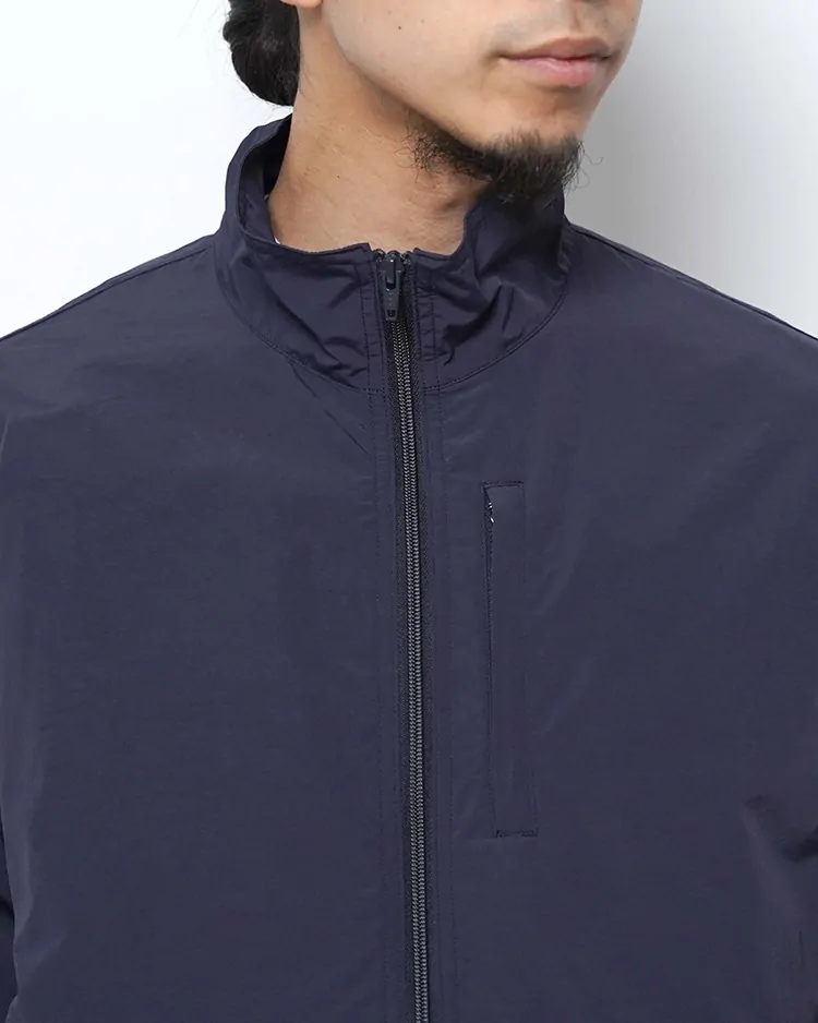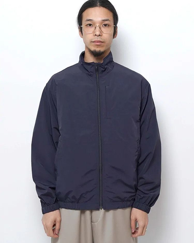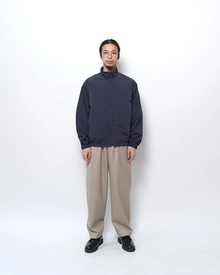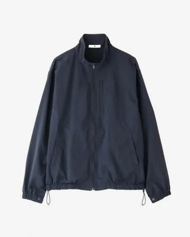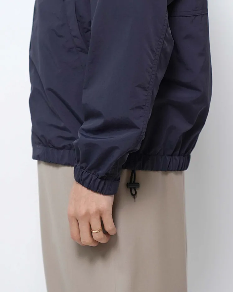 リサイクルナイロンを60%使用し、糸の力で生地を高密度でコンパクトにする超収縮糸を使用しており、この加工技術でしなやかさとハリ・コシ感を表現しています。防風・撥水の高機能素材です。ゆったりとしたシルエットのブルゾンです。袖口と裾はアジャスターで調整できます。