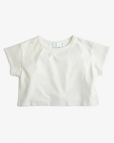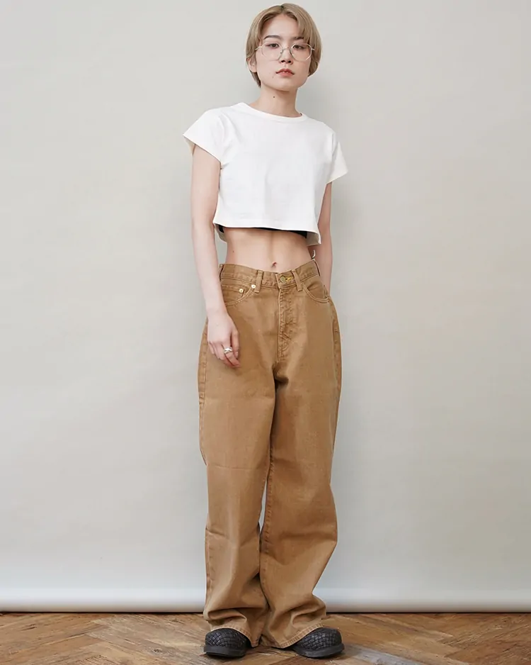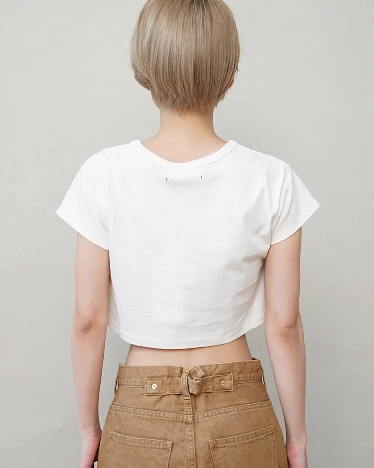 独特なムラ感が特徴の落ち綿を限界まで細番手にして引き揃えることで目が詰まって、粗野感に繊細さが同居する天竺。さらに生地の表面に特殊な微起毛をかけることで独特の滑り感と柔らかさを持たせた。詰まった首元で短めの着丈、ジャストサイズに設計したショートスリーブTシャツ。