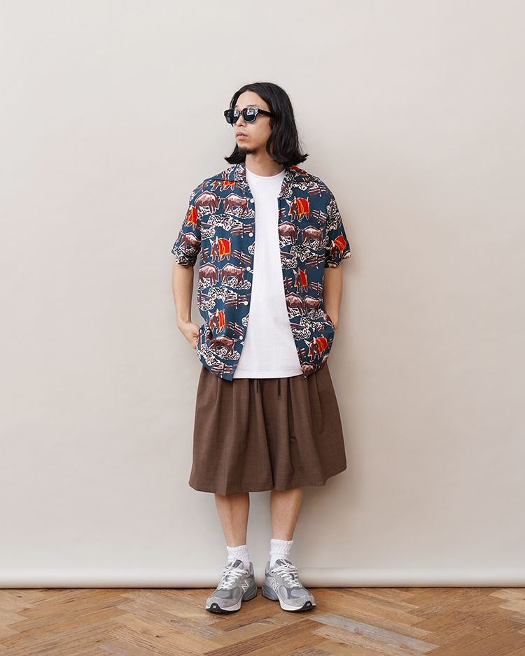 沖縄県の闘牛をモチーフにしたオリジナルテキスタイル「BULL FIGHT」のシルクスクリーンプリントが施されています。