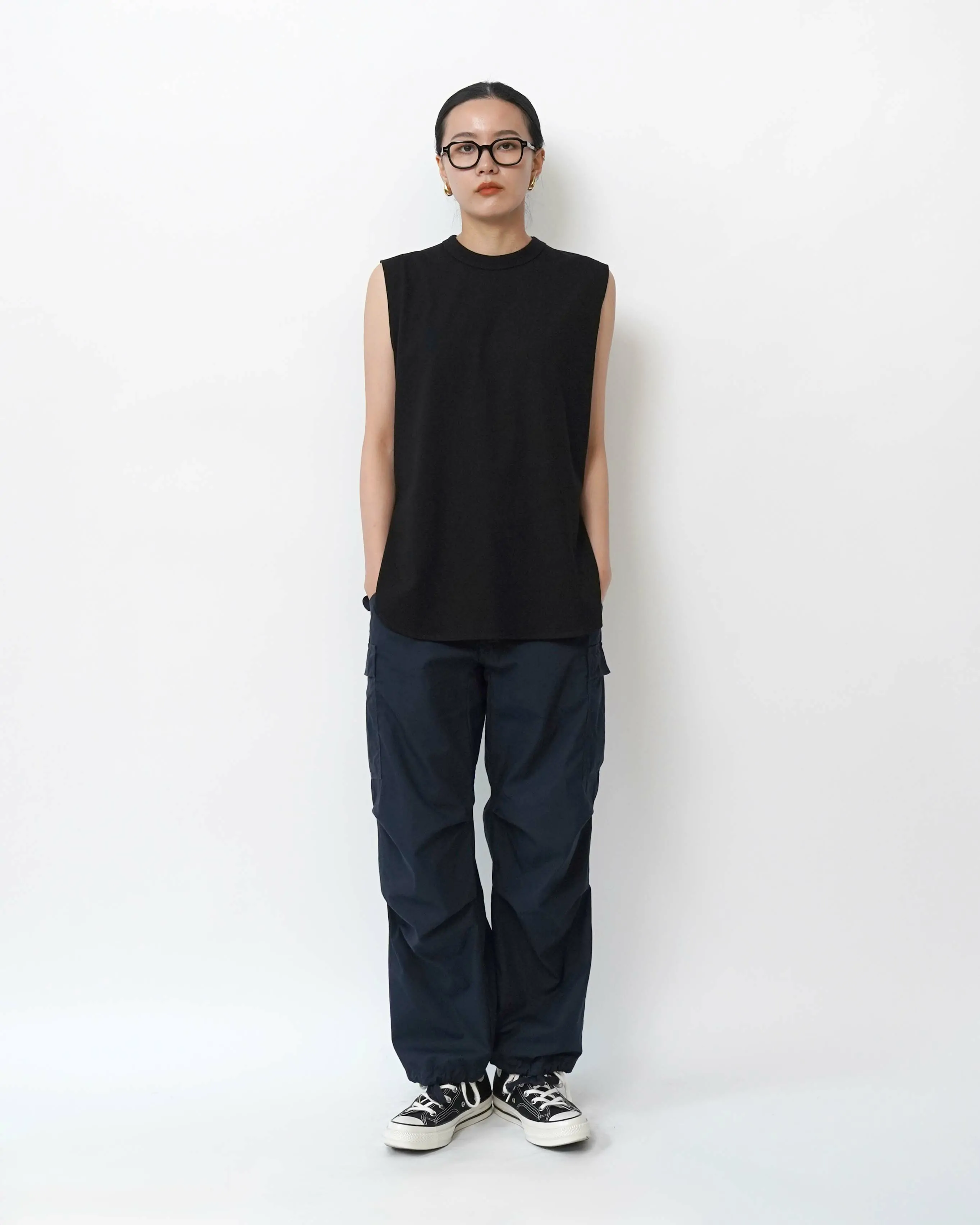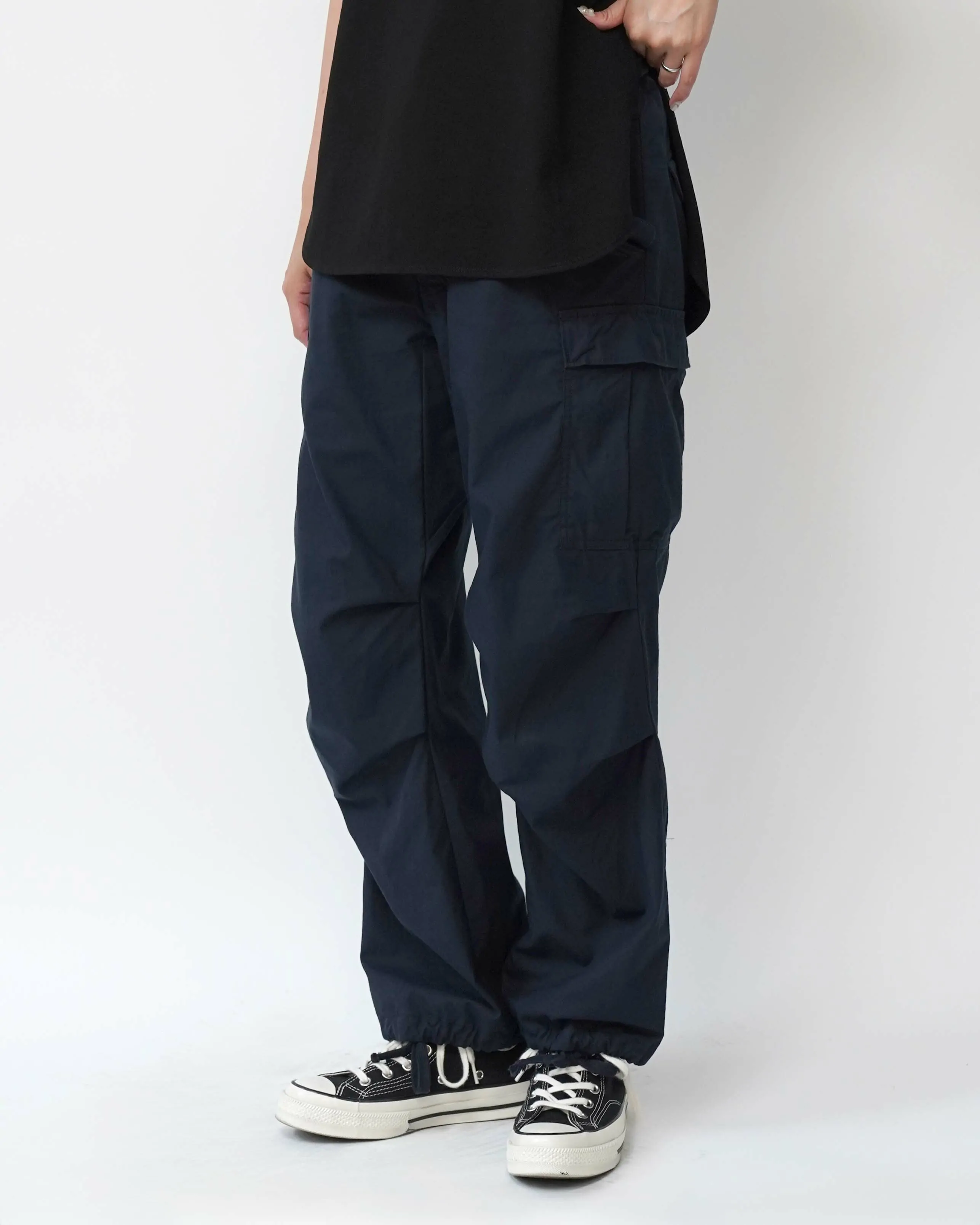 YAECAのフィルターを通して作られたミリタリーカーゴパンツです。ゆったりとしたストレートシルエット。細糸の三子糸をシャトル機で高密度に打ち込んだポプリン生地を使用しています。膝に配されたタックやウエスト部分のアジャスターなど現行モデルのディテールを忠実に再現しつつも、独自のアイテムに昇華しています。