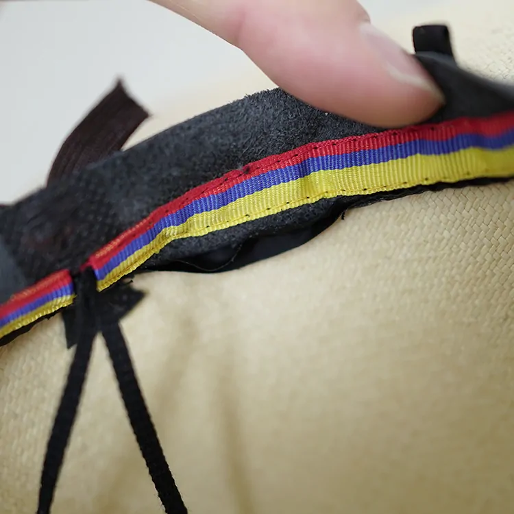 トキヤ草を巻きつけたリボンがアクセントになっています。また内側に配された革紐でサイズ調節が可能。皮紐が通る穴は、通常装飾に使用されるエクアドル国旗の配色のテープを配しています。