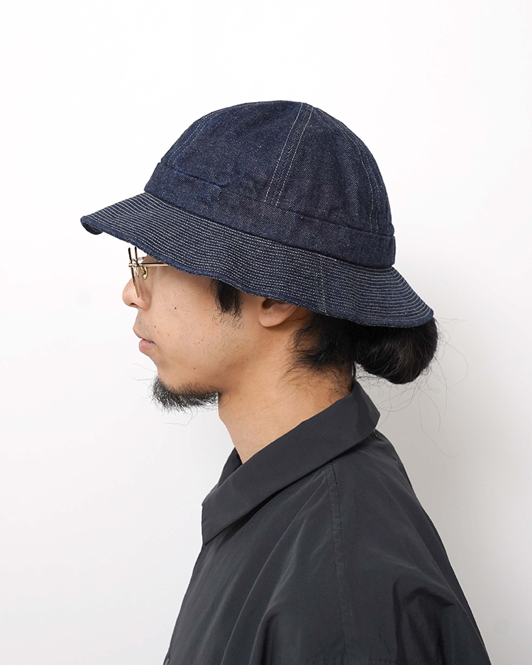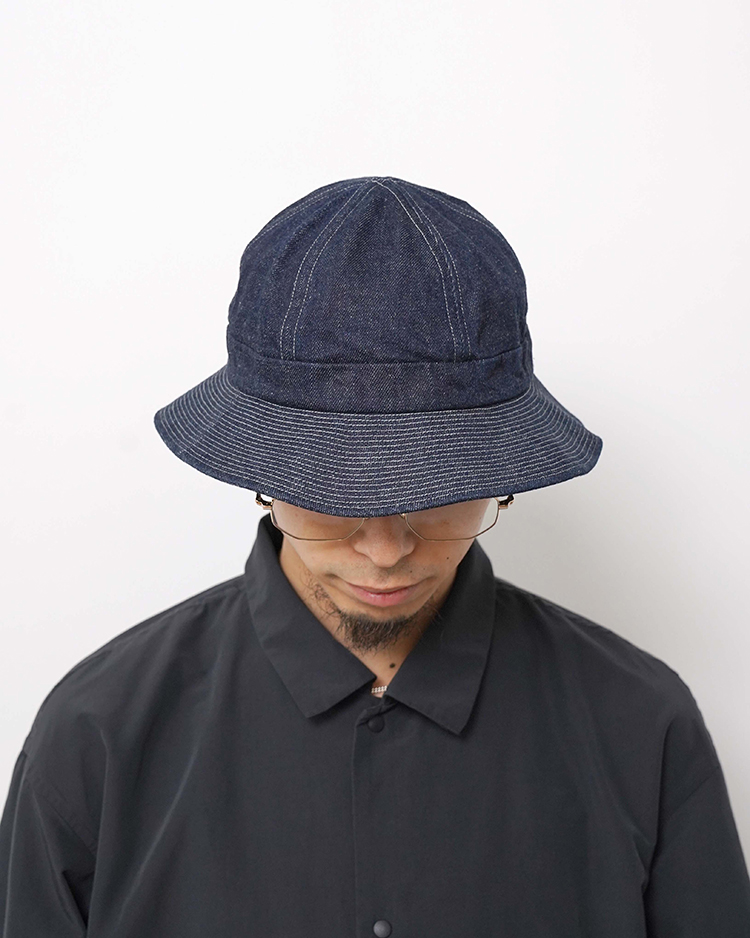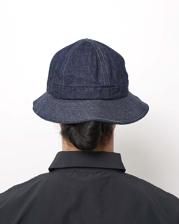 40年代にアメリカの海軍で使われていた帽子をモチーフにしています。蒸し暑い時期にも快適に過ごせるよう、11オンスのさっぱりとしたデニムを使いました。折返しに耐えられるようにツバに細かく入ったステッチは、段々に見えるかもしれませんが、上から下まで一回でぐるぐるとステッチを入れています。