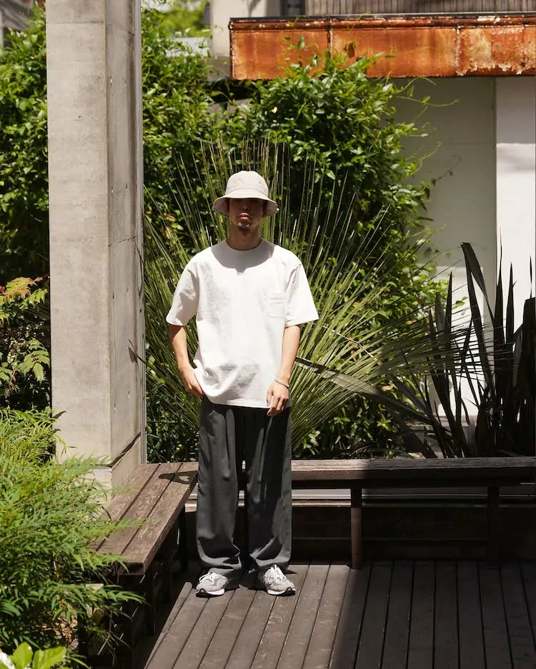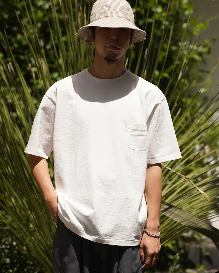 YAECA定番のTシャツの形にしっかりと度詰めされたエメラルド天竺生地を落とし込みました。