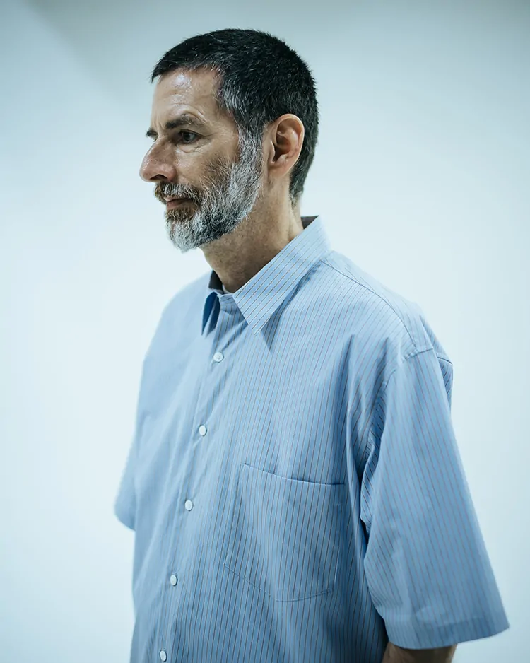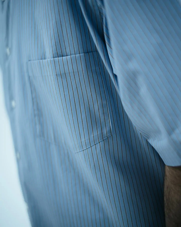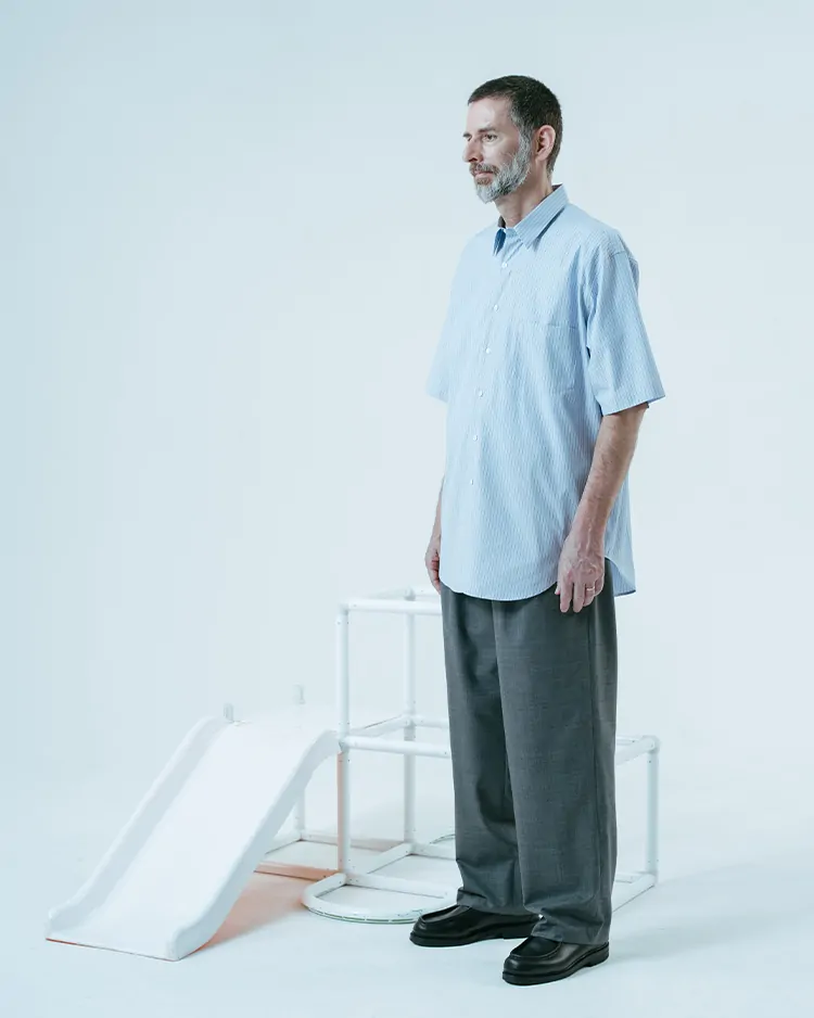 シルエットはクラシックなボタンシャツを参考にしており、そこへモダンな解釈が加えられています。襟は小ぶりで、芯地を控えめにすることで柔らかい印象を与えています。シルエットは身幅にゆとりがあり、サイドタックを施すことで肩の動きやすさを実現しました。裾のラウンドは絶妙なバランスに調整されており、タックイン・アウトどちらのスタイルにも対応できます。半袖の長さは、二の腕が露出しすぎず、ちょうど肘にかかる程度のバランスで設計しており、上品な印象を保ちつつ、快適さも追求した仕上がりです。