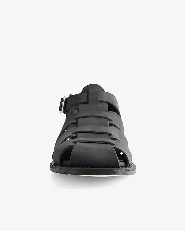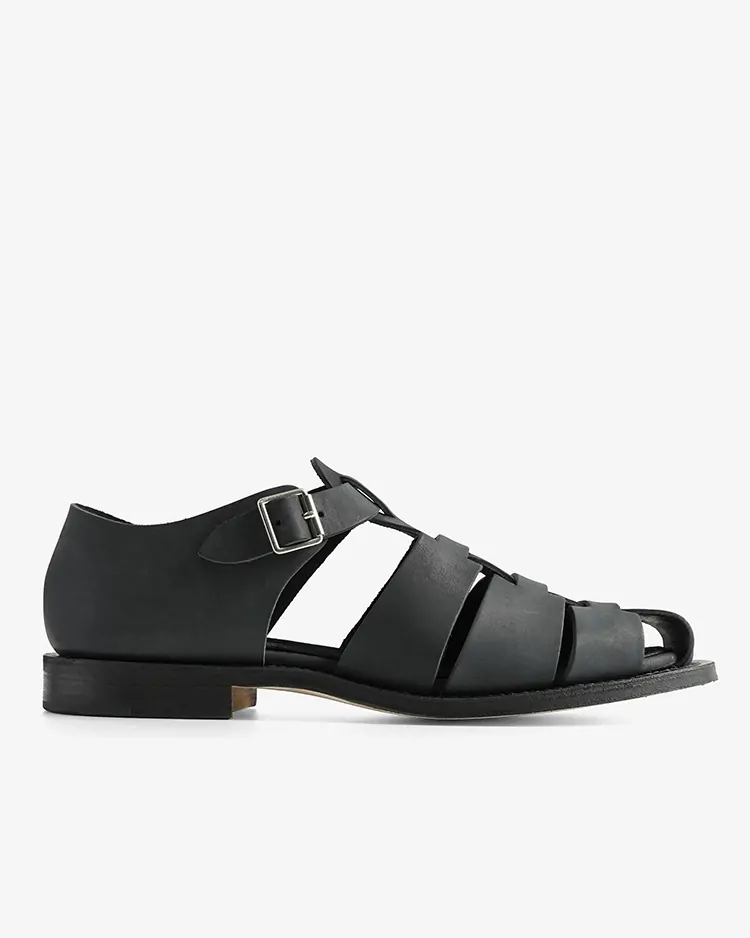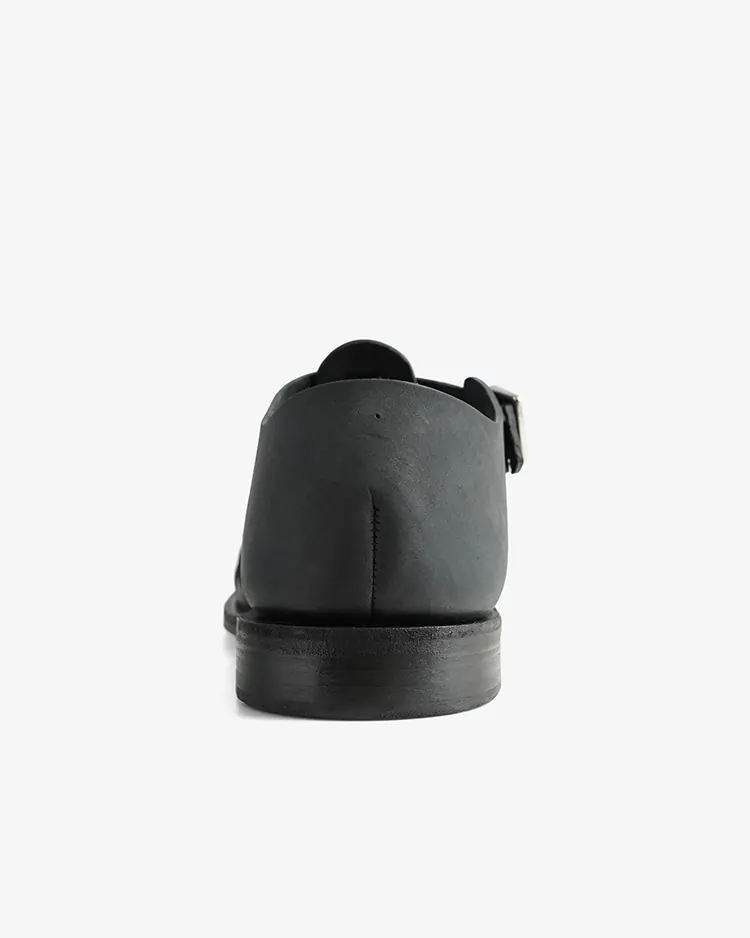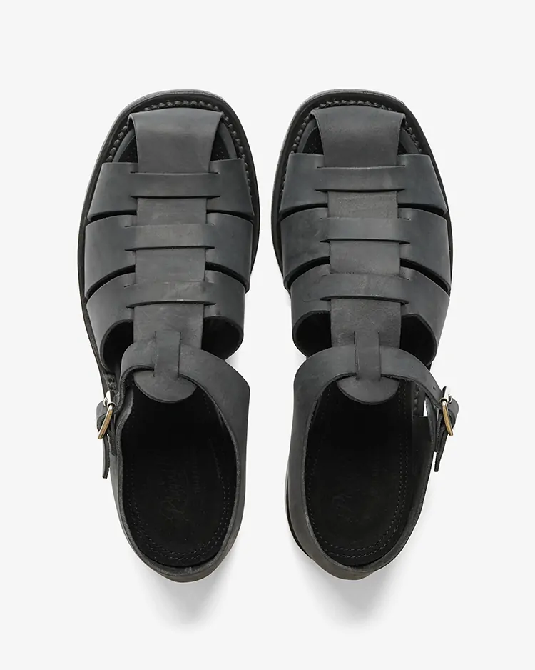 フレンチミリタリーサンダルを再構築。マッケイ製法を用い、レザーソール使用で オールソール交換は数回可能。肌の見える分量を少なく設計したアッパーの作りが特徴。オリジナルラスト。