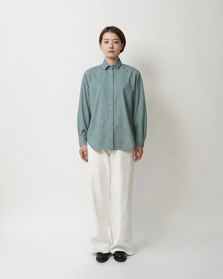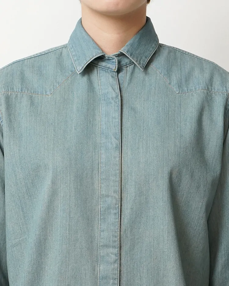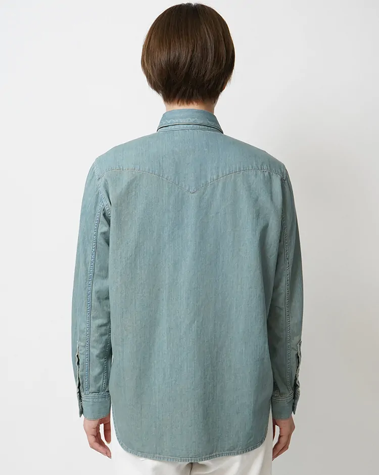 ウエスタンシャツの特徴であるヨークは裏で切り替え、フロントボタンは比翼仕立てに、フロントポケットも無くすことで洗練された印象に。アクセサリー着用時にスタイリングの邪魔をしません。