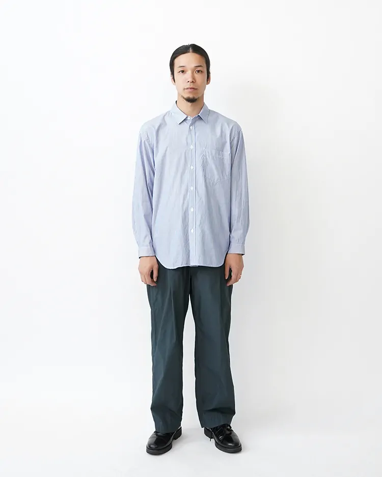 アメリカのスーピマコットンを使い、浜松市でゆっくり織られた平織り素材に、東近江市で生地をしっかり揉みこんで、密度を上げる加工を施した素材です。製品染 めで綿本来の膨らみを最大限引き出した、滑らかでとても軽いエイトンオリジナル素材です。