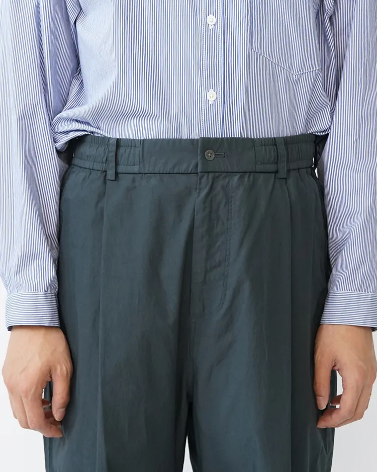 ゆったりとしたワイドシルエットで、裾に向かってややテーパードしたシルエットが特徴のパンツです。ベルトループつきですが、ベルト内側に紐が通っており、ベルトなしで調整して着用可能です。製品で染めているので、タンブラー乾燥かけても縮ます、速乾性もあり、イージーケアです。