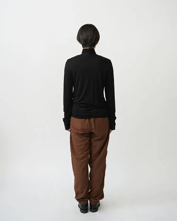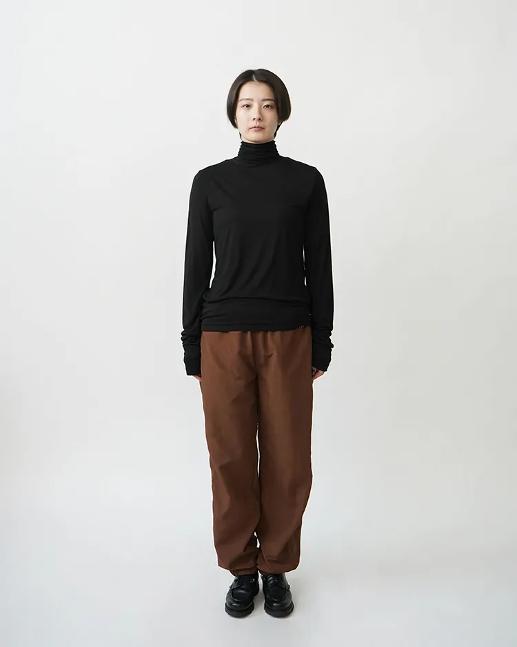 レイヤリングに活躍するシャープなシルエットのタートルネックカットソー。衿部分だけ編地をリブに切り替えているので、首元に沿ったすっきりとしたシルエットが出るようになりました。襟端は折り返さずクチュールのテクニックを使ってニットのように軽く仕上げています。袖丈を長めに設定しているので襟元だけでなく袖口のレイヤリングも楽しめるカットソーです。