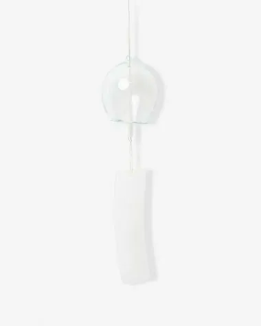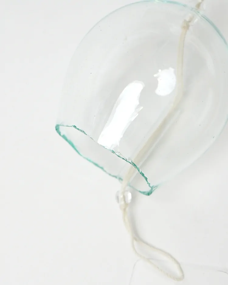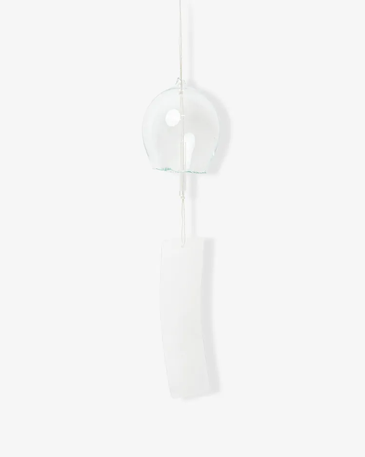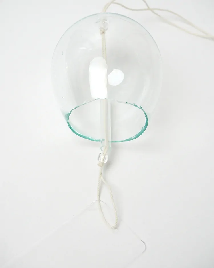 この江戸風鈴は当時と同じ製法で、玉と筒ともに手吹きで作っていますが、提げ紐以外はすべて透明にしました。和室はもちろん、洋室にも馴染む、現代の風鈴です。