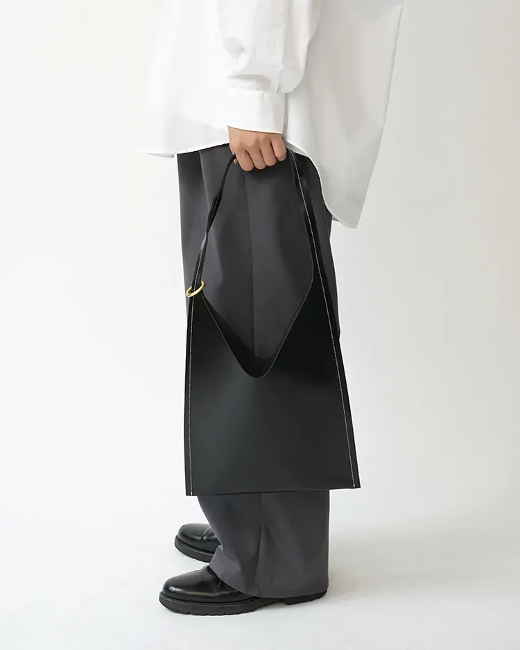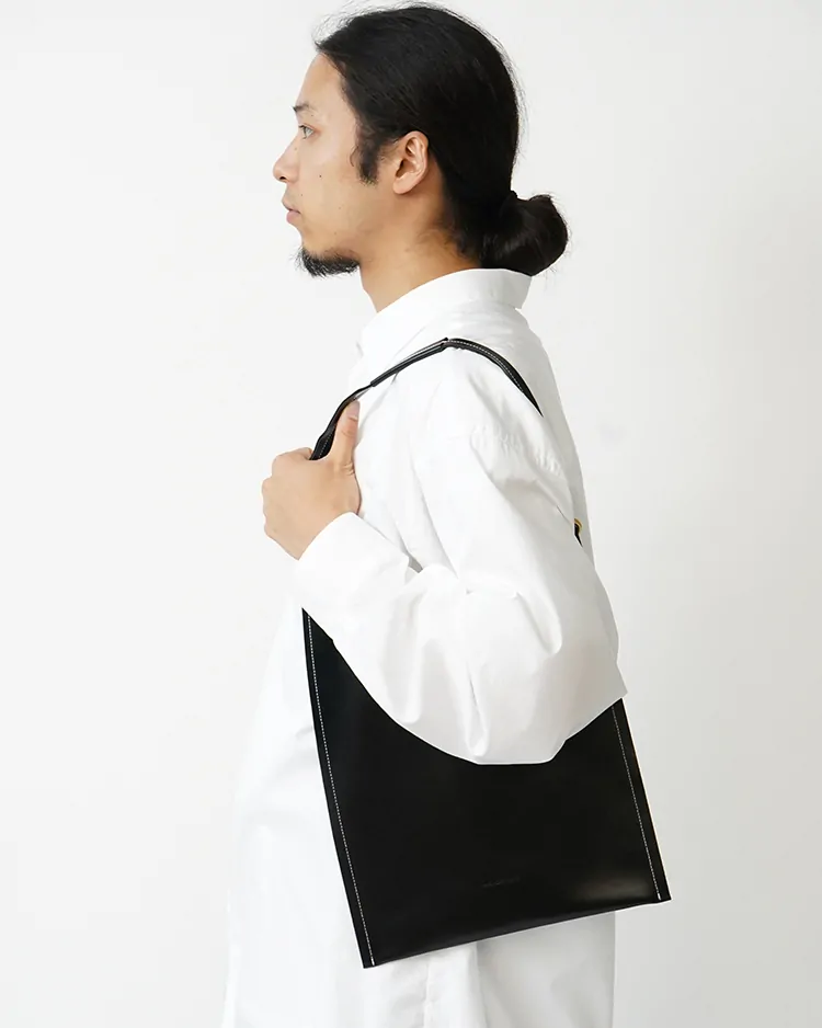 最小限の要素で構成されたシリーズで、一枚の革を折りたたんだ本体にホワイトステッチとリングがアクセントとして施されています。