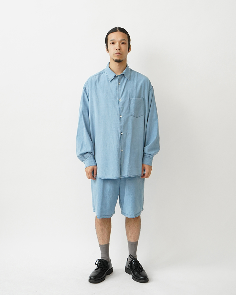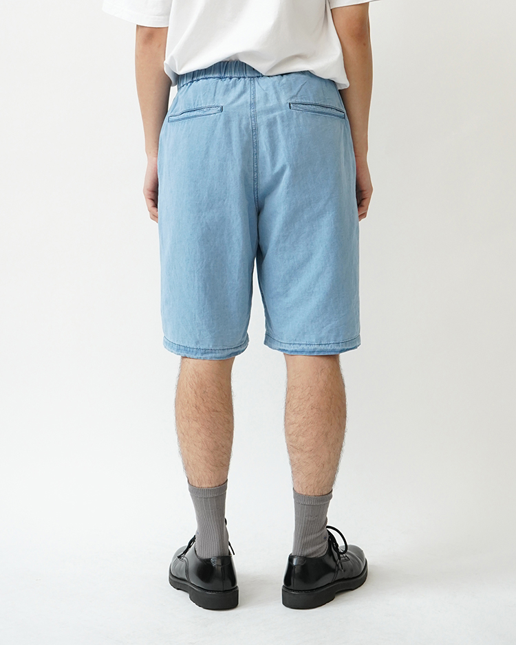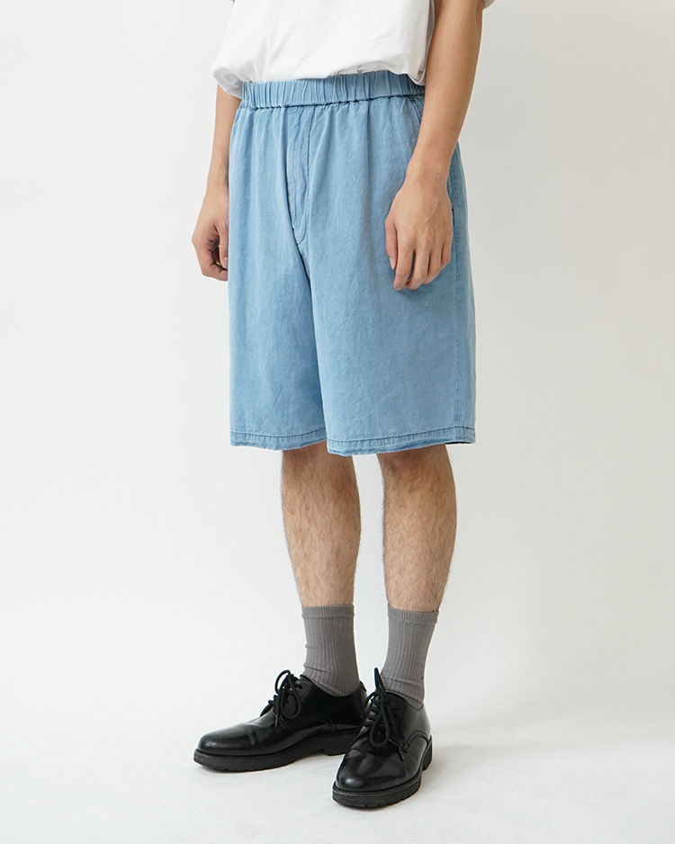 太番手の糸を高密度に織り上げ、縦糸の密度を高めることで指先に感じる清涼感あるタッチが特徴的なインディゴ染めのコットンポプリン。製品での洗いを入れることでデニムような色落ちやアタリ感ある表情で仕上げたイージーショーツ。