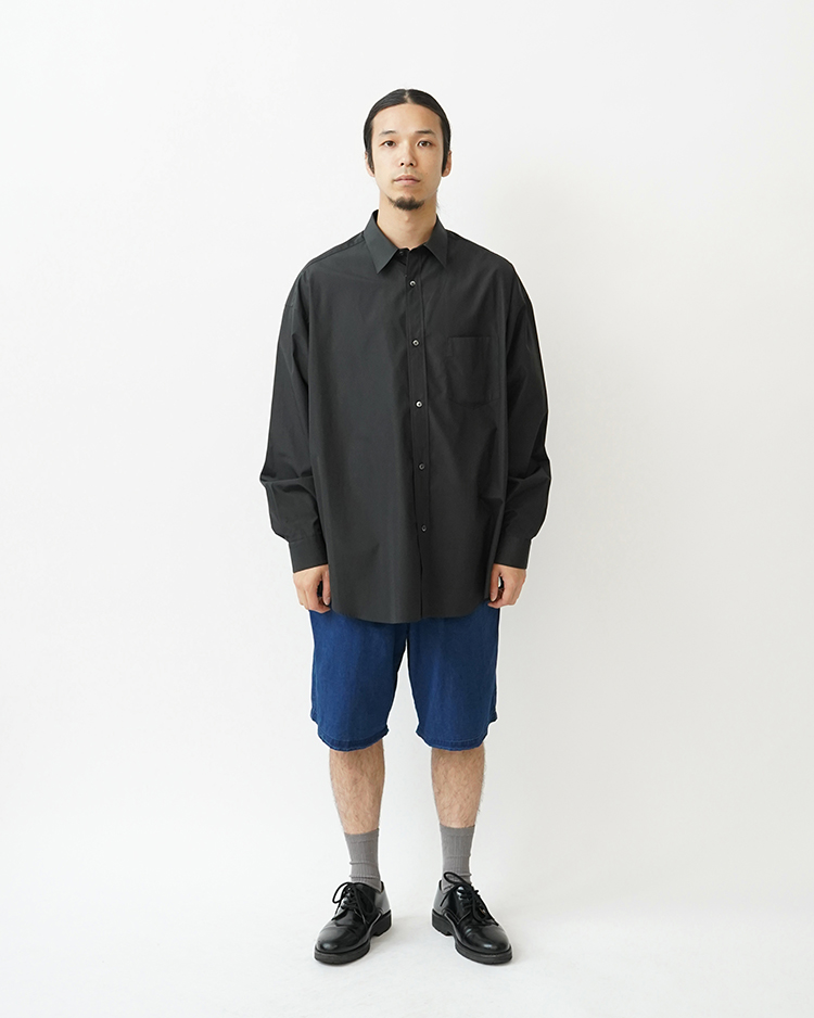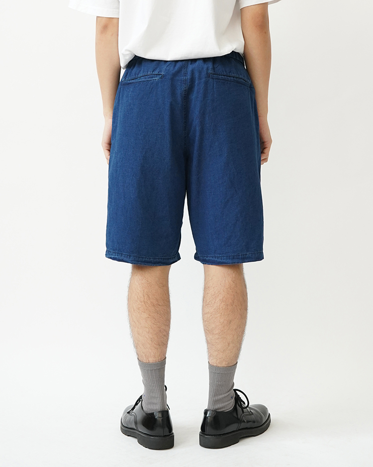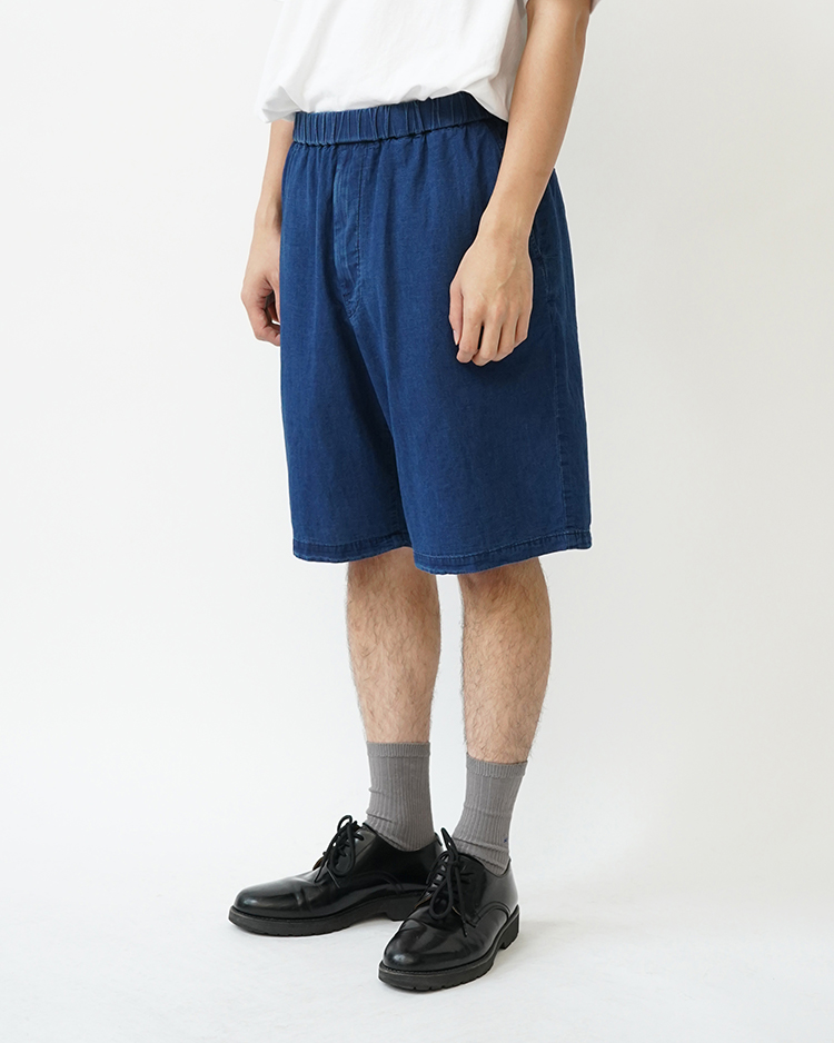 太番手の糸を高密度に織り上げ、縦糸の密度を高めることで指先に感じる清涼感あるタッチが特徴的なインディゴ染めのコットンポプリン。製品での洗いを入れることでデニムような色落ちやアタリ感ある表情で仕上げたイージーショーツ。