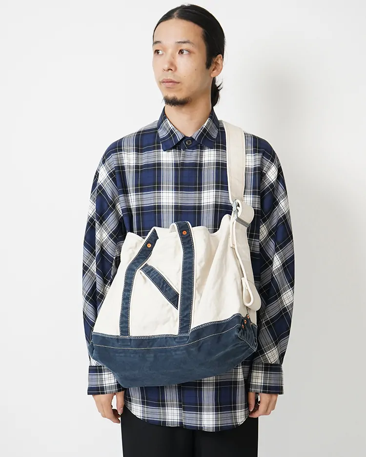 1920~50s にかけて現れたUSツールバックからインスピレーションを受け、現代的解釈を取り入れ製作したNNショルダートートバッグ。 長い歴史の中でも作りや形状が変わらないオールドな仕様に惚れ込みました。 N型のハンドルなどショルダーバッグとして使いやすい形状にアップデートしたオリジナルデザイン。 生地は国産のシャトル織機にて織り上げらた6号と10号帆布にワッシャー加工を施し、 再度製品後に特殊加工を施すことでビンテージのキャンバスに見られる独特のやれたアタリ感を演出しています。