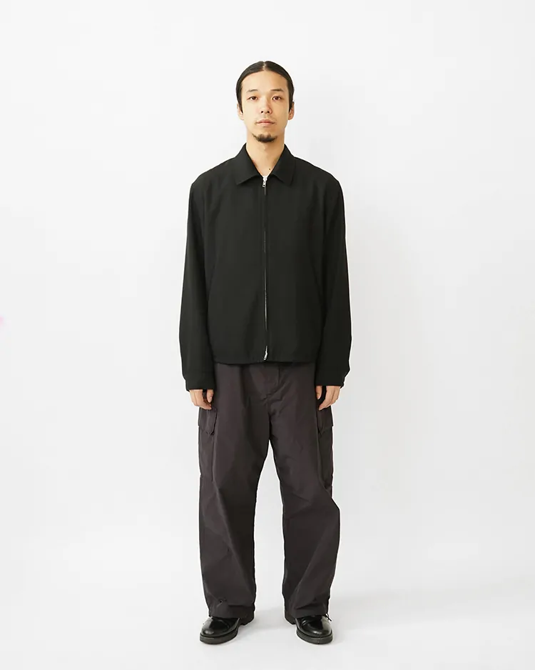 ナイロンとポリエステルの熱収縮率の違いを生かし、環境の変化により表情が変わっていく様を楽しむことのできる、天然繊維のような糸を使用し、石川県能美市にて高密度に織り込むことにより、独特の風合いを表現した素材です。製品染めで仕上げ、撥水加工を施しています。ライナーはしっかりと保温性が伴うので、真冬でも着用することができます。