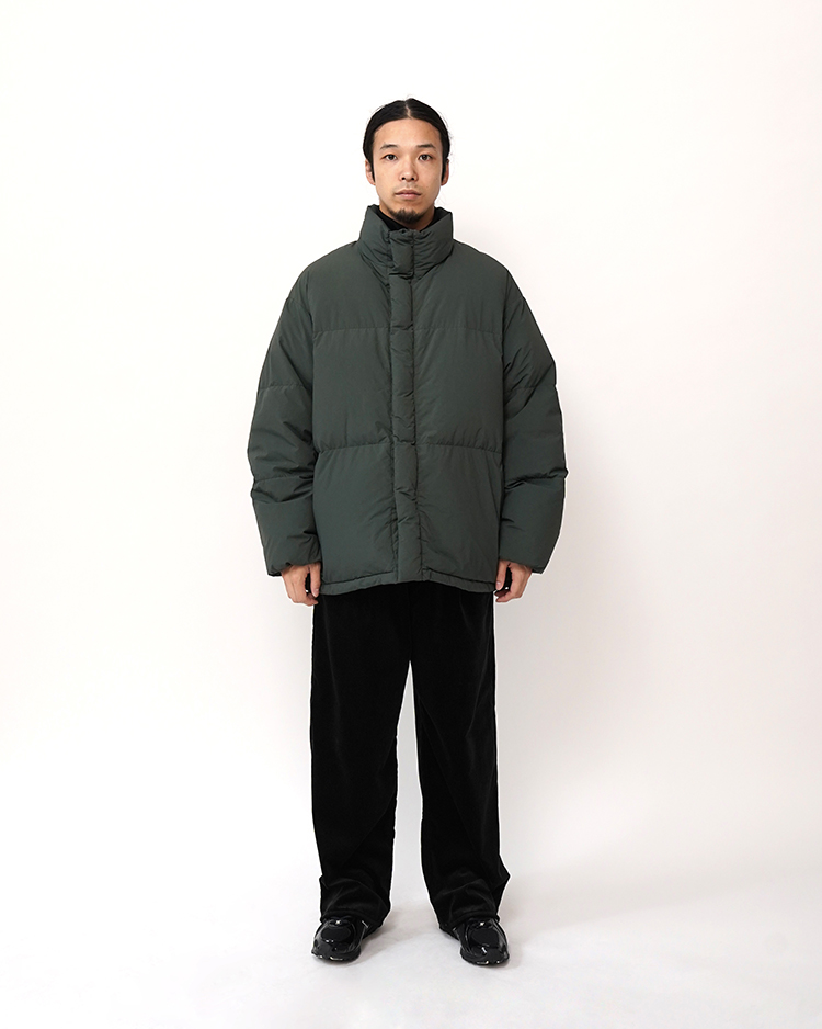 高密度に製織して表面を微起毛させた無染色のナイロンを使用したダウンジャケット。縫製後に染色を施すことで独特な色ムラや縮みによるパッカリングとアタリ、ドライな質感でペーパーライクなハリ感も特徴。大胆に3分割したダウンルームに良質な羽毛を贅沢に詰め込んだボリュームのあるシルエットが主張する一着。ポケットに裾ドローコードを隠したミニマルなディティールも魅力です。