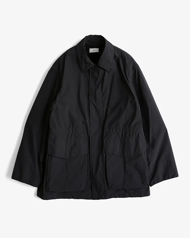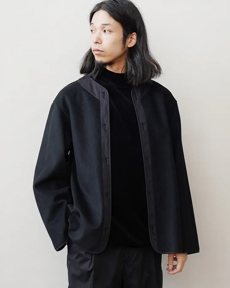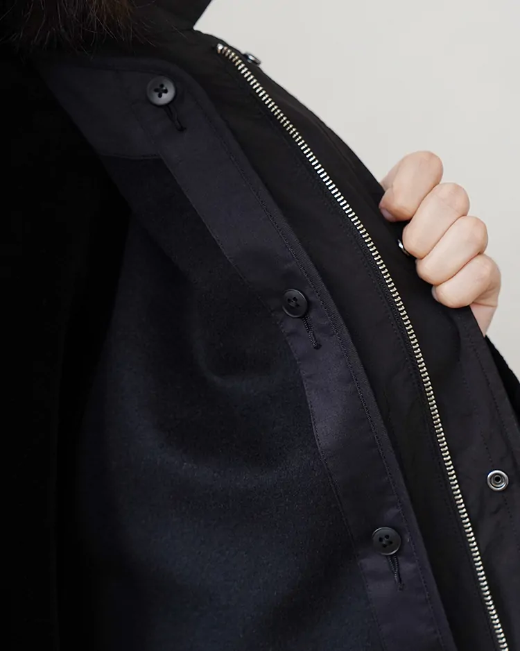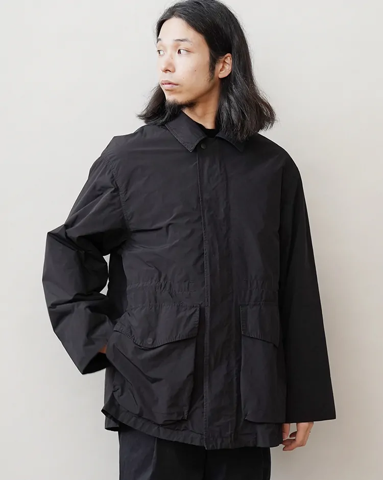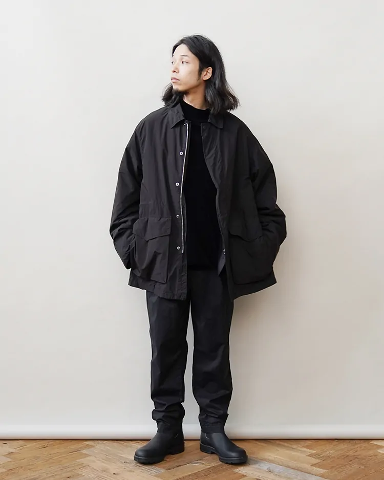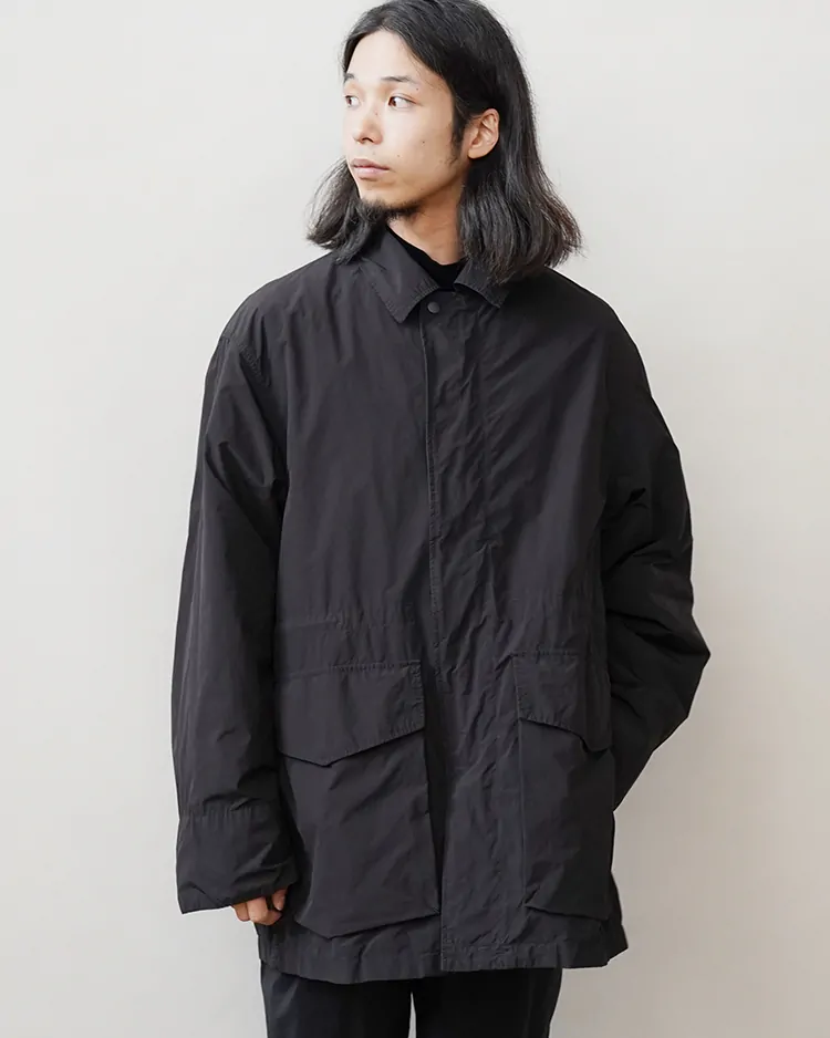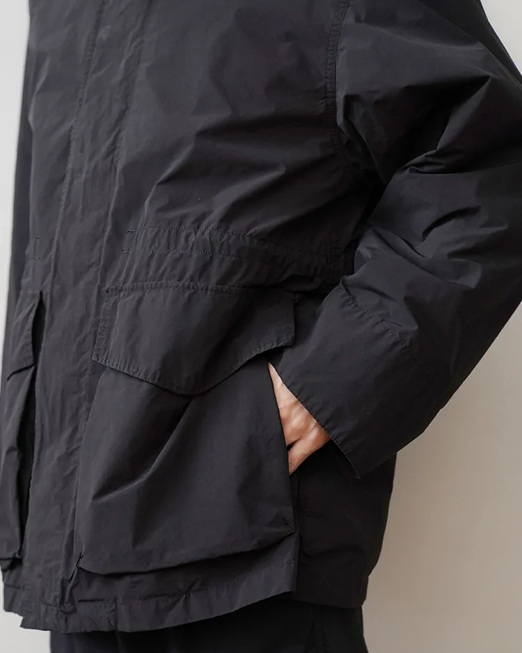 ナイロンとポリエステルの熱収縮率の違いを生かし、環境の変化により表情が変わっていく様を楽しむことのできる、天然繊維のような糸を使用し、石川県能美市にて高密度に織り込むことにより、独特の風合いを表現した素材です。製品染めで仕上げ、撥水加工を施しています。ライナーはしっかりと保温性が伴うので、真冬でも着用することができます。