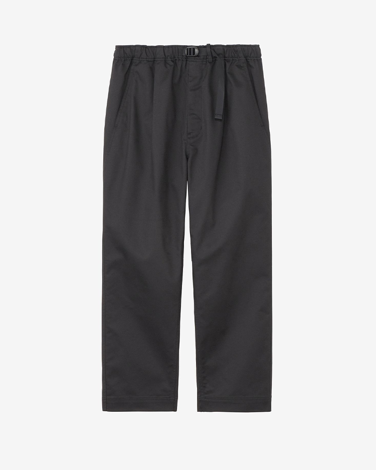 生地には、ナチュラルな素材感をもたらすコットンと、ストレッチ性や形態安定性に優れたソロテックス、ペットボトルが原料のリサイクル素材を一部に使用したポリエステルを交織したツイル生地を採用。ウエストは平ゴムのイージー仕様で、バックルでサイズ調節が可能。股下はフルレングスの設計で、マチを付けることで脚を動かしやすくしています。