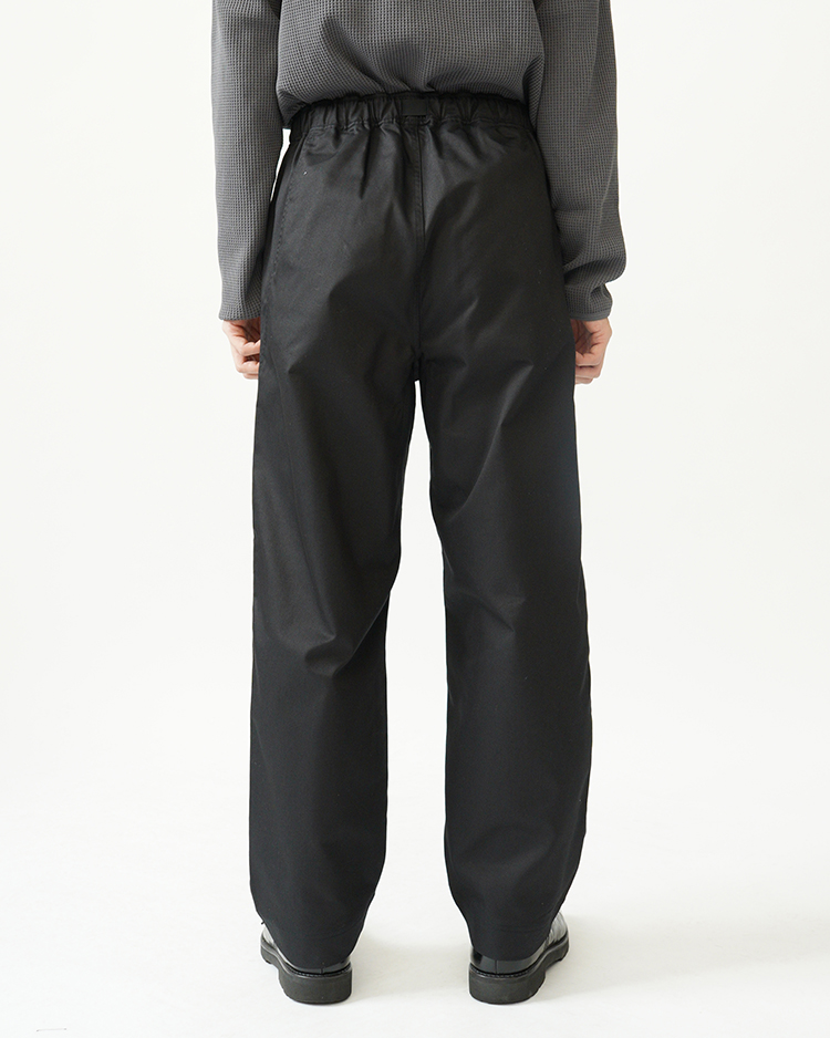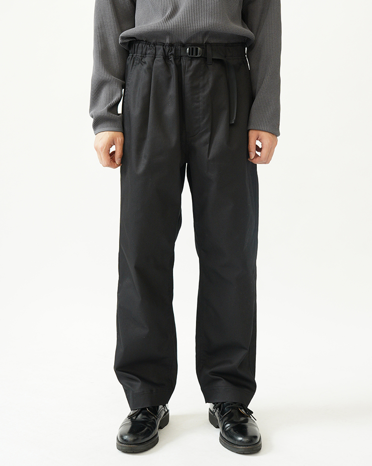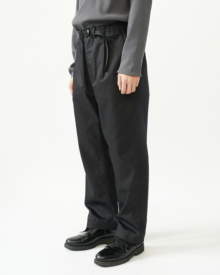 ワンタックが入ったワイドストレートシルエットで、カジュアルな装いにフィット。両腰にポケットがあり、右側にはセキュリティポケットも配しています。バックポケットは、ヒップラインに沿うようカーブさせた切り替えラインを活かして配置。縫製をダブルステッチにしてパッカリングを出し、カジュアルな印象に仕上げました。環境への負荷に配慮して、素材の一部にリサイクル糸を使用しています。