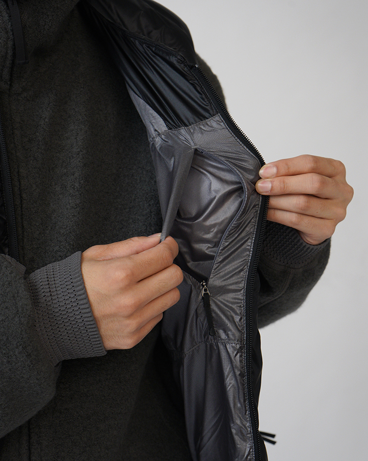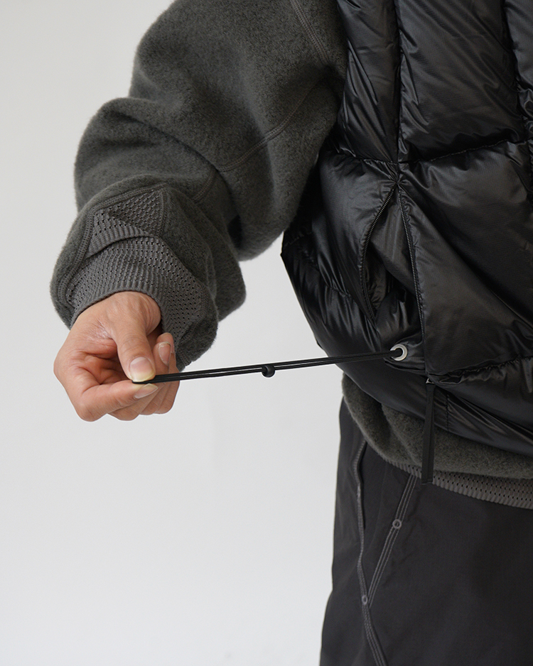 Goldwin が開発した、折り紙のようなプリーツによってダウンバッフルを立体化し暖かさを増す「3D Box Baffle」を全体に取り入れたダウンベスト。単体をアウターとして着用するほか、ジャケットの外側への重ね着にも使用できます。シルクのような光沢感があり摩擦に強いナイロン生地、Pertex Diamond Fuse を使用。