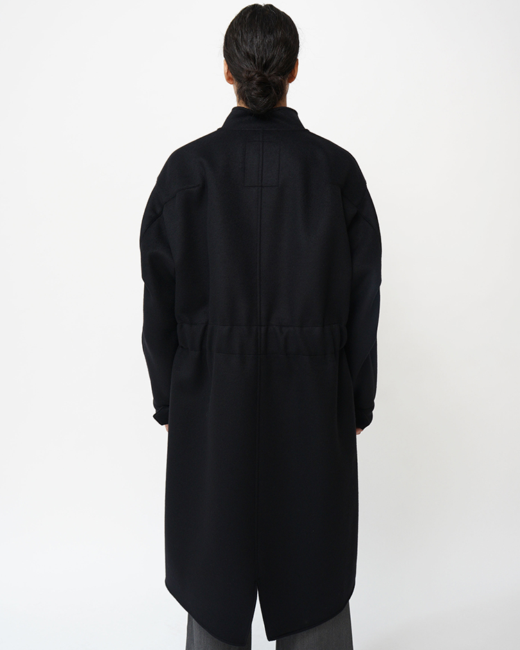 袖の後ろ側にはドルマンスリーブを採用し、アームホールに施したタックが肩まわりの動きやすさを生む。ウエストには太めのゴムを配し、背面のシルエットをすっきりとまとめている。