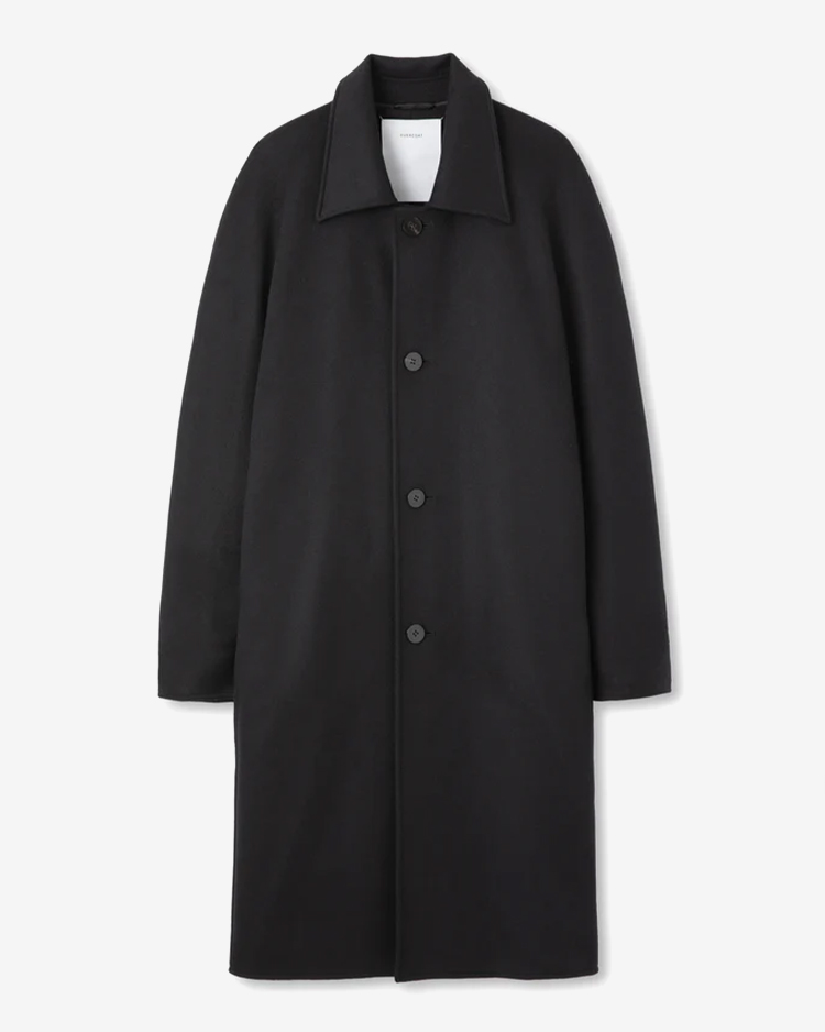 滑らかなビーバー素材を使用した、ステンカラータイプのオーバーコート。