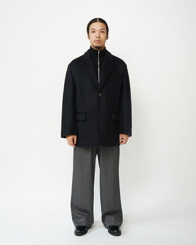 Super120’sクラスの紡毛ウールを使用し、両面に起毛を施すことで、表裏どちらにもなめらかな手触りと柔らかな光沢が生まれている。