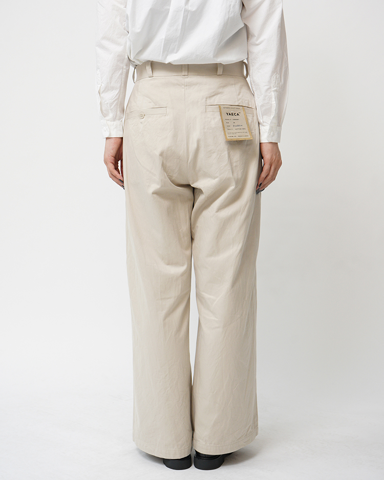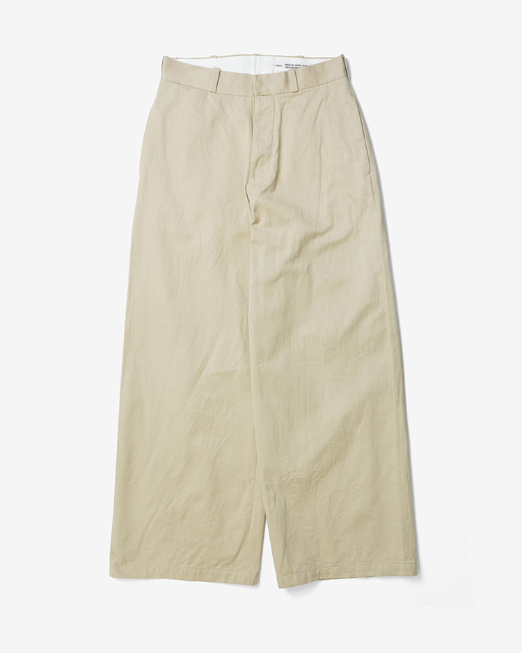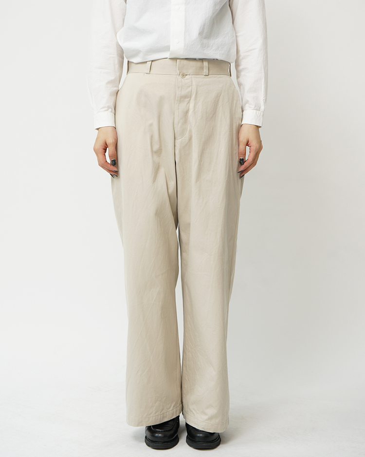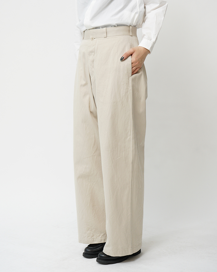 ワイドは太めのストレートですが、股上は深くしすぎず、上品な雰囲気に仕上げたチノパン。ウエストから裾に向かって広がっていく、マリンパンツのようなシルエットです。