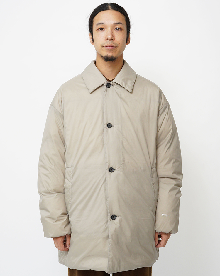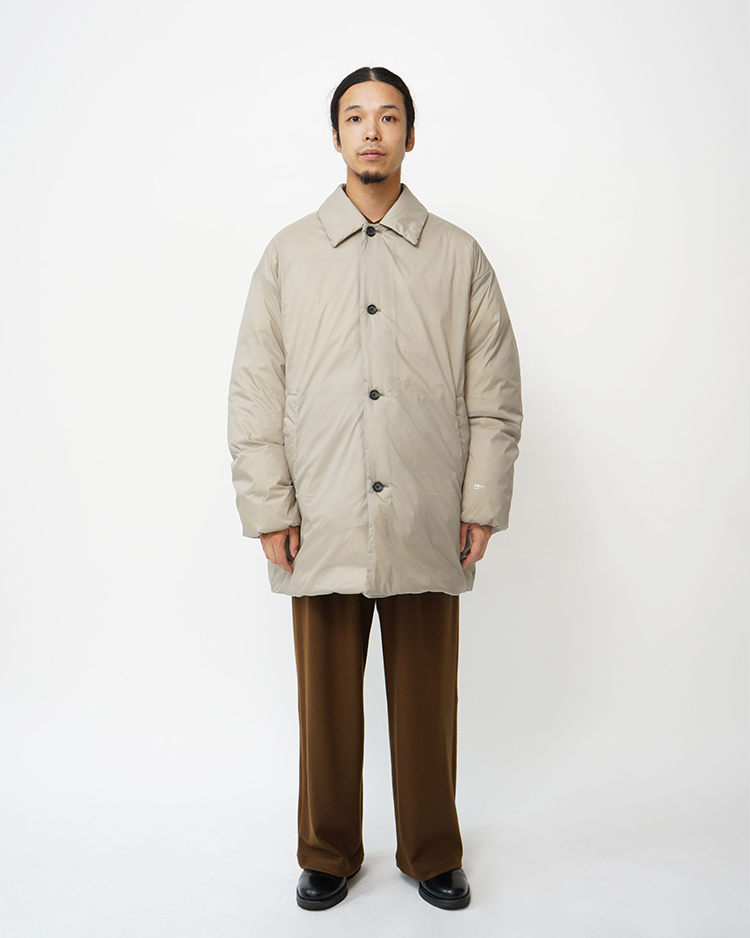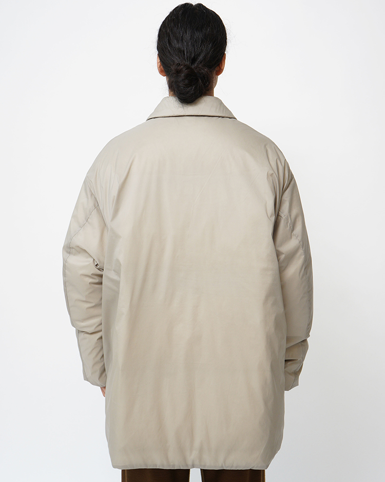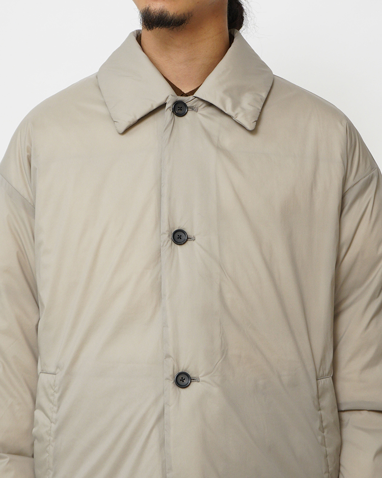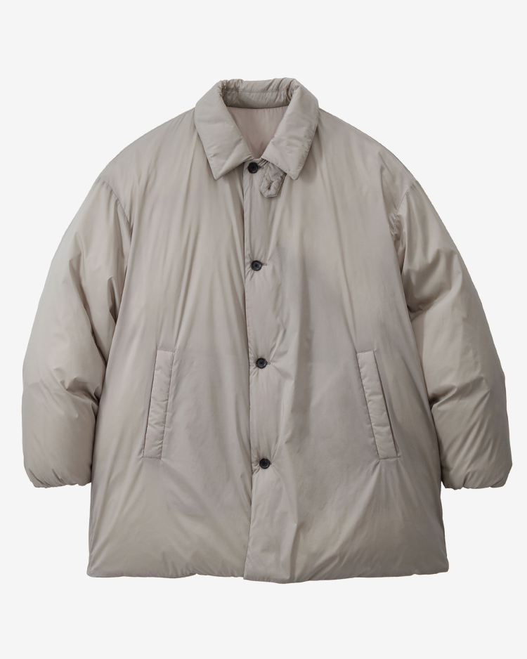 高密度に織り上げた極細ナイロン素材・PERTEX QUANTUM AIR_を使用したバルカラーコート。贅沢にダウンを封入しながら、表面はギャザーやキルトを排したミニマルなデザインに。優れた耐久性と防風性、そして高い保温力を兼ね備えた、無骨さと洗練が共存する一着です。