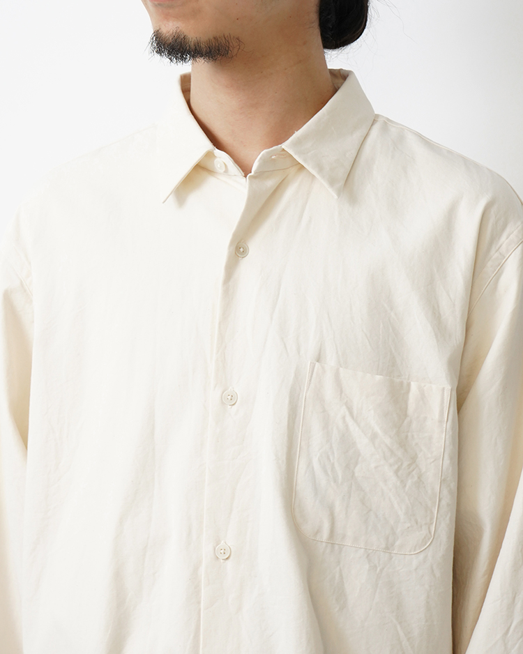 身幅も大きく、着丈も長め。大きなシルエットだけど、どこか品のある。ゆったりと大きめに羽織るのが気持ちいい、YAECA定番のボタンシャツです。