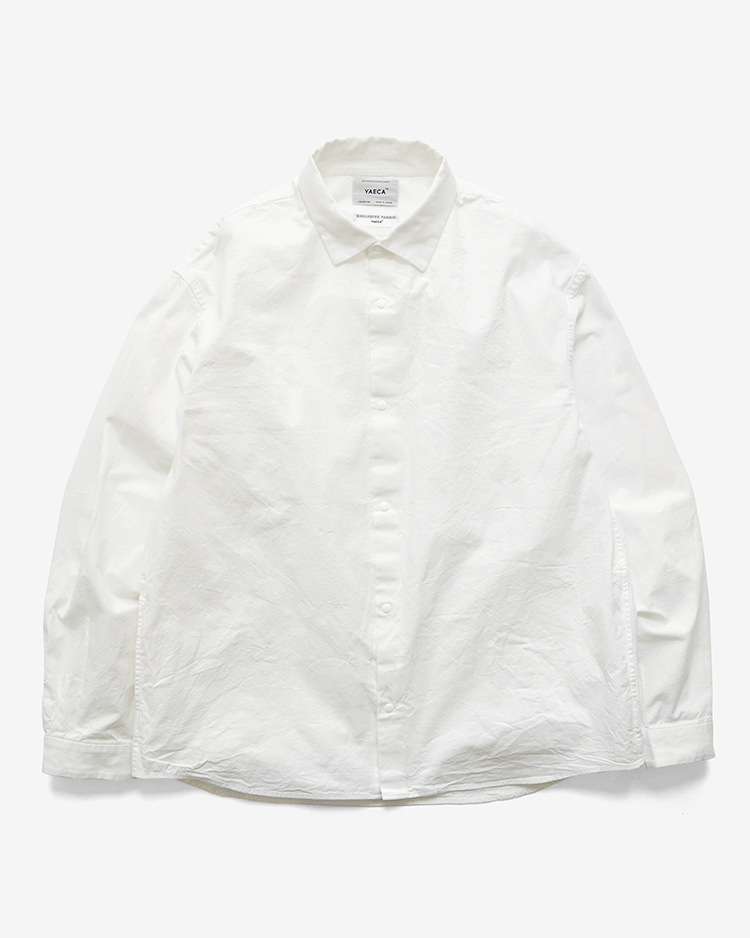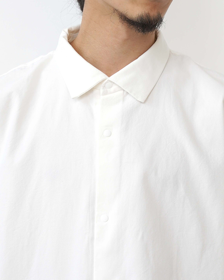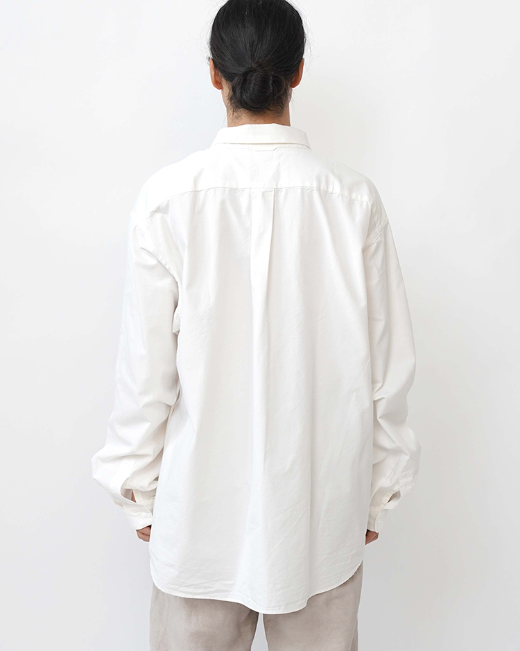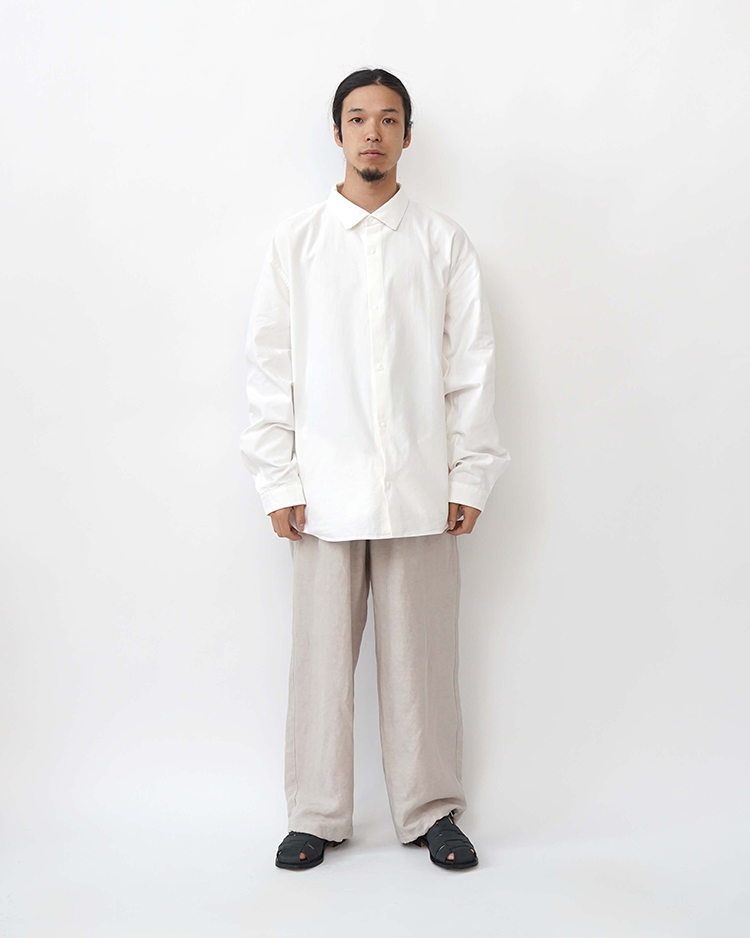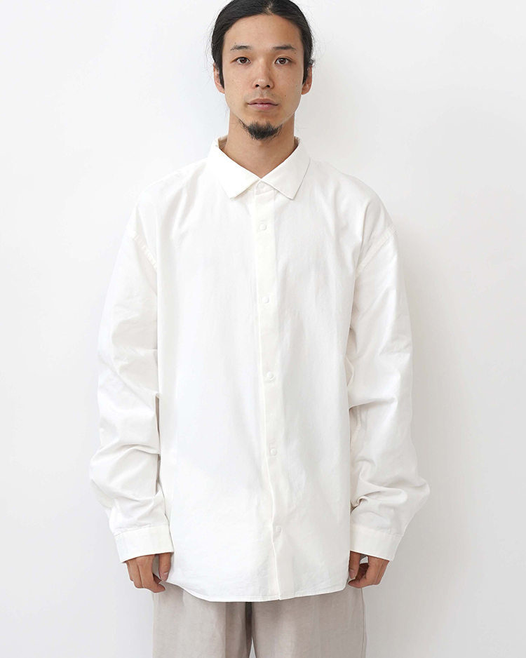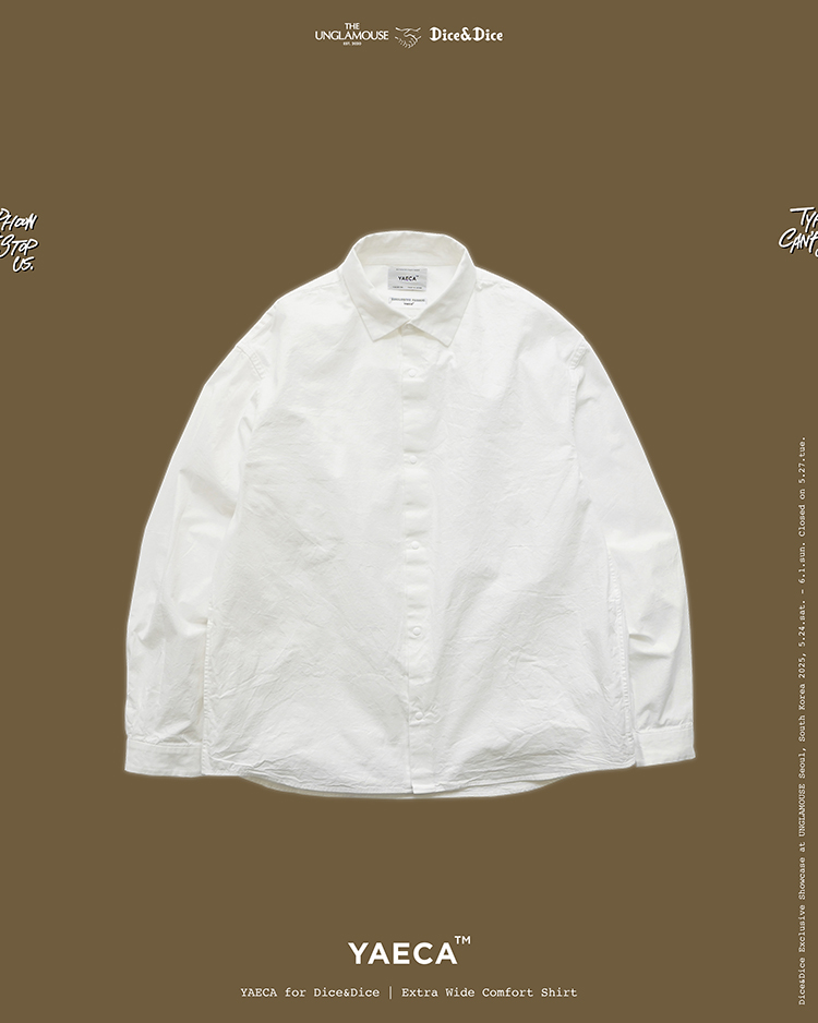 YAECAの定番「エクストラワイドコンフォートシャツ」をベースに、Dice&Dice の別注仕様として製作されたモデルです。通常展開のないFREEサイズで仕立てられ、肩幅・身幅にゆとりを持たせた、リラックス感のあるシルエットが特徴です。前立てには片手でも開閉可能なスナップボタンを採用。日常の動作に配慮したユニバーサルデザインで、機能性と簡潔な見た目を両立しています。生地には、高密度に織られたコンパクトオックスフォードを使用。洗い仕上げにより、一般的なオックスフォードに見られる強いハリ感を抑えつつ、 適度な厚みと耐久性、そして柔らかな風合いを備えています。ノンアイロンで の着用を想定し、あえてやや粗野な表情に仕上げている点も特長のひとつで す。両裾にはハンドポケットを配置。裏地には丸みをもたせ、ゴミがたまりにくいよう設計されています。細部に至るまで実用性と使い心地を意識して作り込まれた、プロダクト志向の一着です。