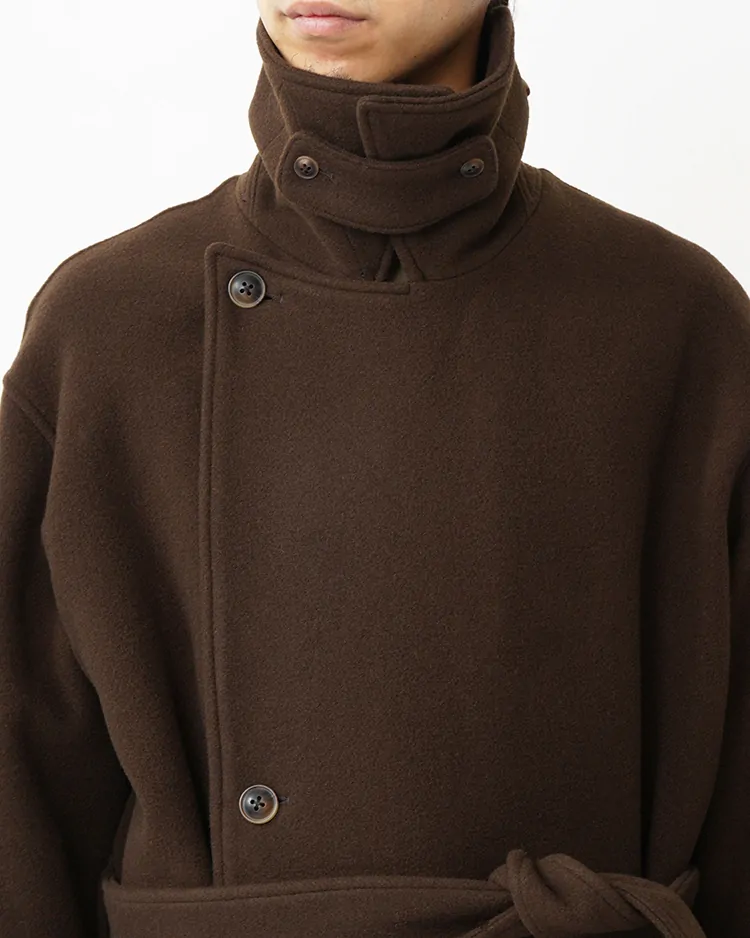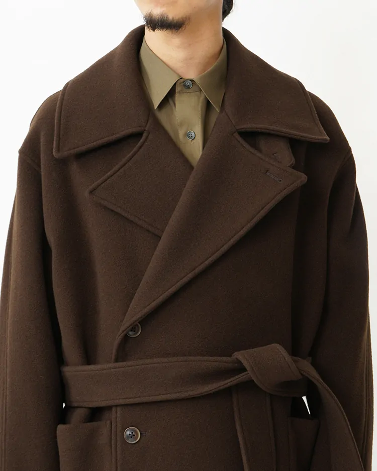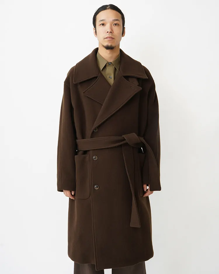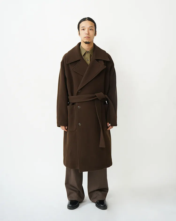 ざっくりとした着用感が特徴のダブルコート。襟を立てフラップで留めて着用でき、またウエストベルトを縛ってシルエットに変化を持たせることが可能です。