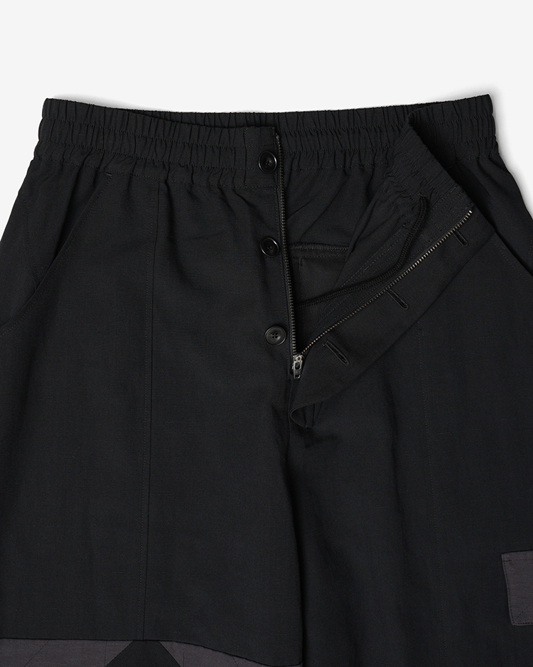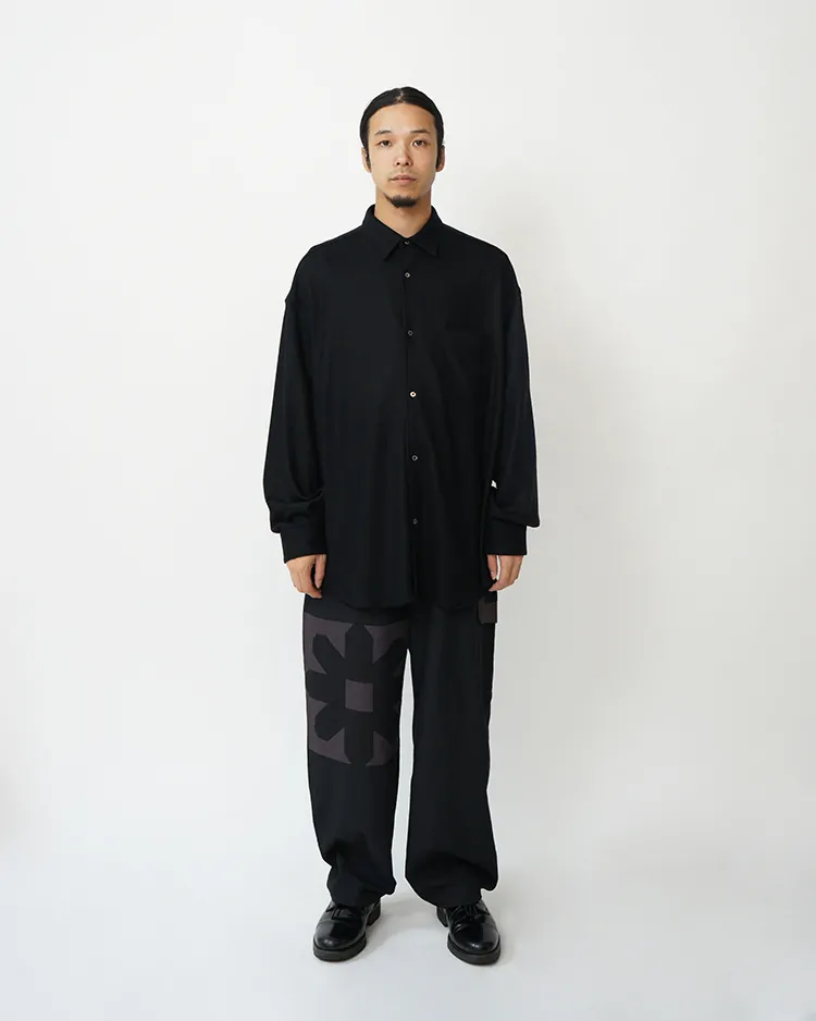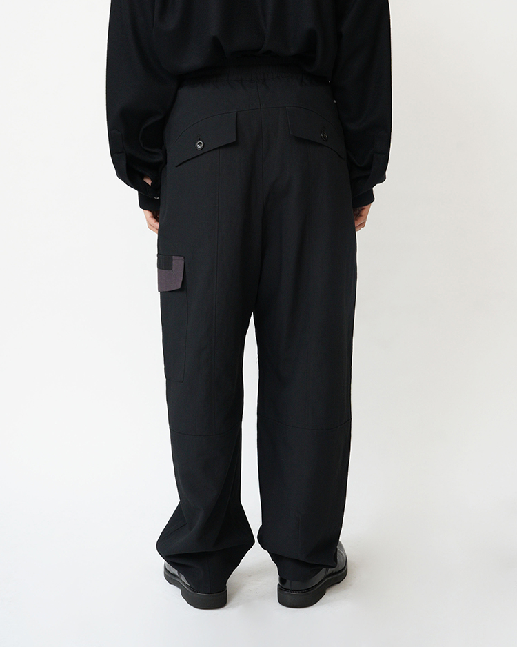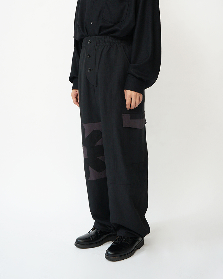 右膝にフラワーのパッチワークを施しました。天然繊維と化繊で織り上げ、表情感がありドライで程よい落ち感のある生地を使用。化繊部分はリサイクル原料を使用。ワタリ部分のボリュームがあり裾にかけて少し絞ったシルエット。