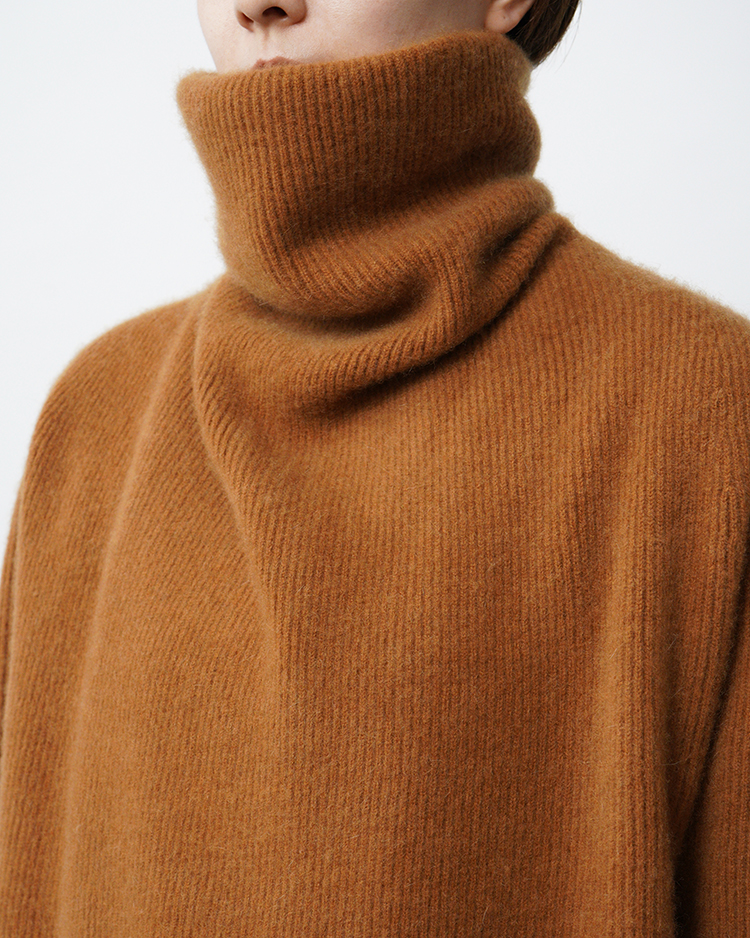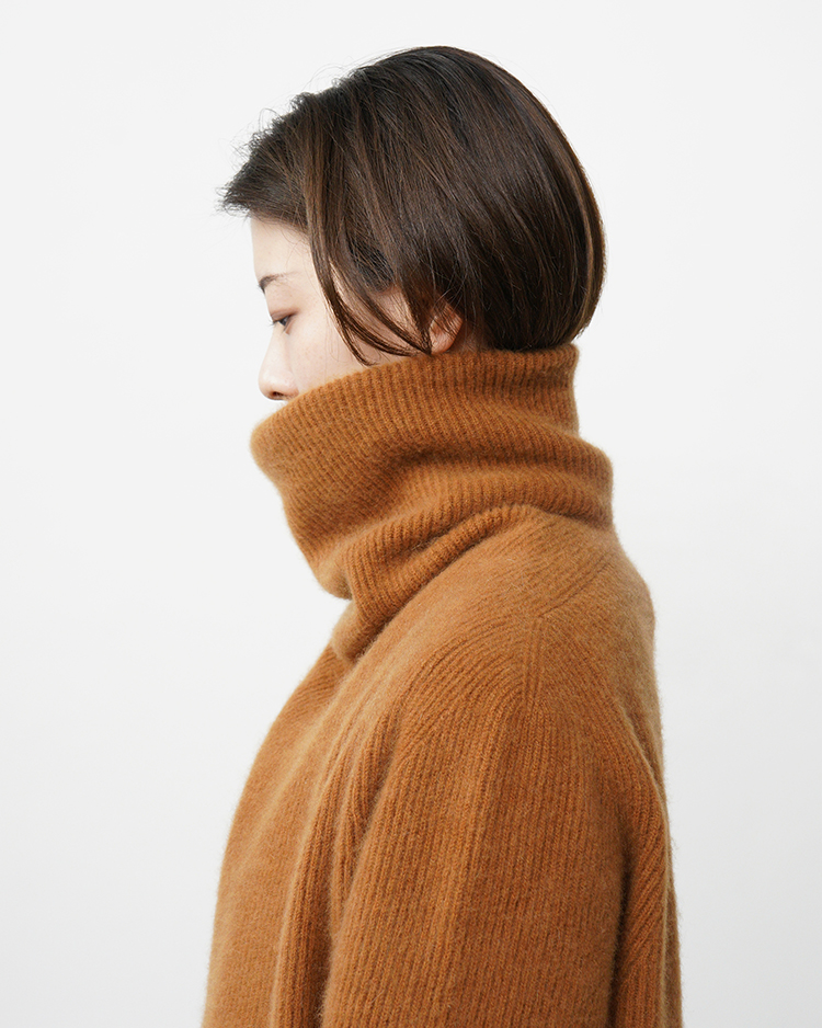 ほんのり青みがかった淡いグレーのブルーフォックスと、カシミヤの主要産地の一つとして知られるアルランシャン産の、ふくらみ豊かなカシミヤを使用。これらを、相互の特徴を最大限に引き出す3:1の黄金比でブレンドし、丁寧に紡績しました。この素材ならではの、上質な起毛感、軽やかさ、そして滑らかな肌触りが特徴の商品。着丈はやや短めで、袖丈はあえて長めにデザイン。ボリュームのあるタートルネックも魅力のポイント。