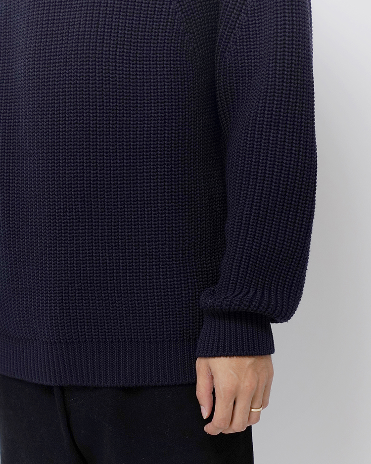 SOLID WOOLという独自に開発した糸を使用し、キレイな編目・ダレない強度・毛玉ができにくい・チクチクしないという理想のミドルゲージニットを目指しました。