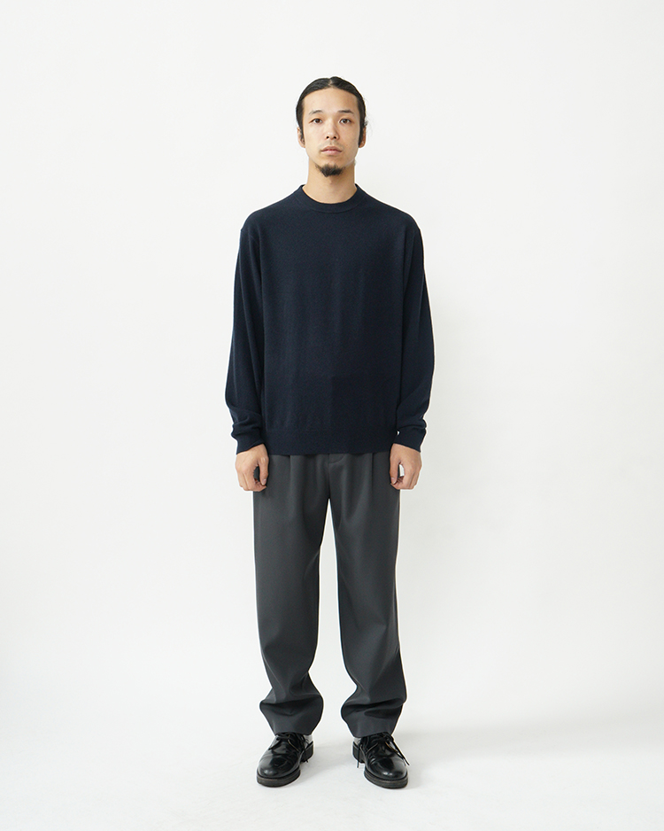 程よいリラックス感が特徴のクルーネックセーター。14ゲージを採用し、限界度目でしっかりとした着心地に仕上げました。衿はリブダブル付けを採用しています。裾リブが適度に締まった、ニットらしいシルエットを採用しています。