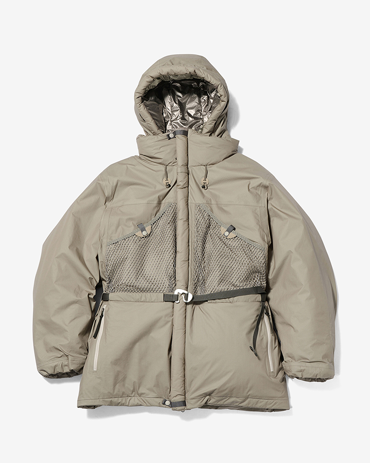高機能素材をオーバーサイズの特徴的なシルエットで仕立てた軽量中わたアウター。WINDSTOPPER by GORE-TEX LABS 2層ラミネートの中で最軽量のリップストップ生地でPrimaLoftの中わたを包んでいます。メッシュポケットやインサレーション入りチューブフラップ、取り外し可能なフェイスカバー、ウエストのベルトなど、様々な機能ディテールを備えたデザインです。
