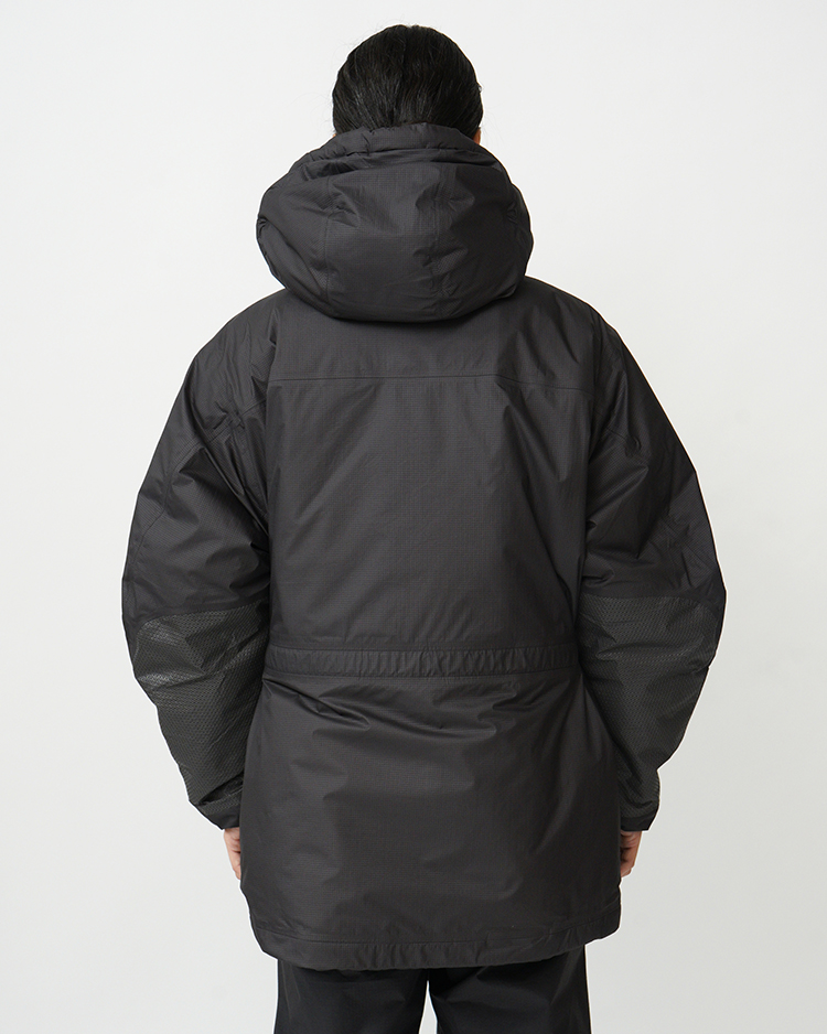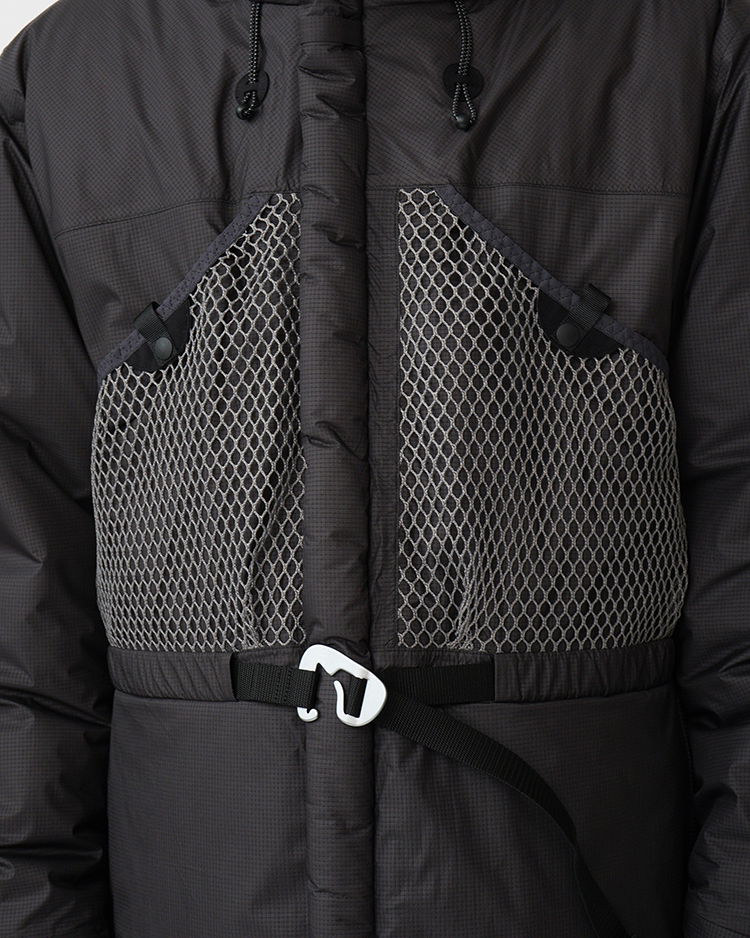高機能素材をオーバーサイズの特徴的なシルエットで仕立てた軽量中わたアウター。WINDSTOPPER by GORE-TEX LABS 2層ラミネートの中で最軽量のリップストップ生地でPrimaLoftの中わたを包んでいます。メッシュポケットやインサレーション入りチューブフラップ、取り外し可能なフェイスカバー、ウエストのベルトなど、様々な機能ディテールを備えたデザインです。