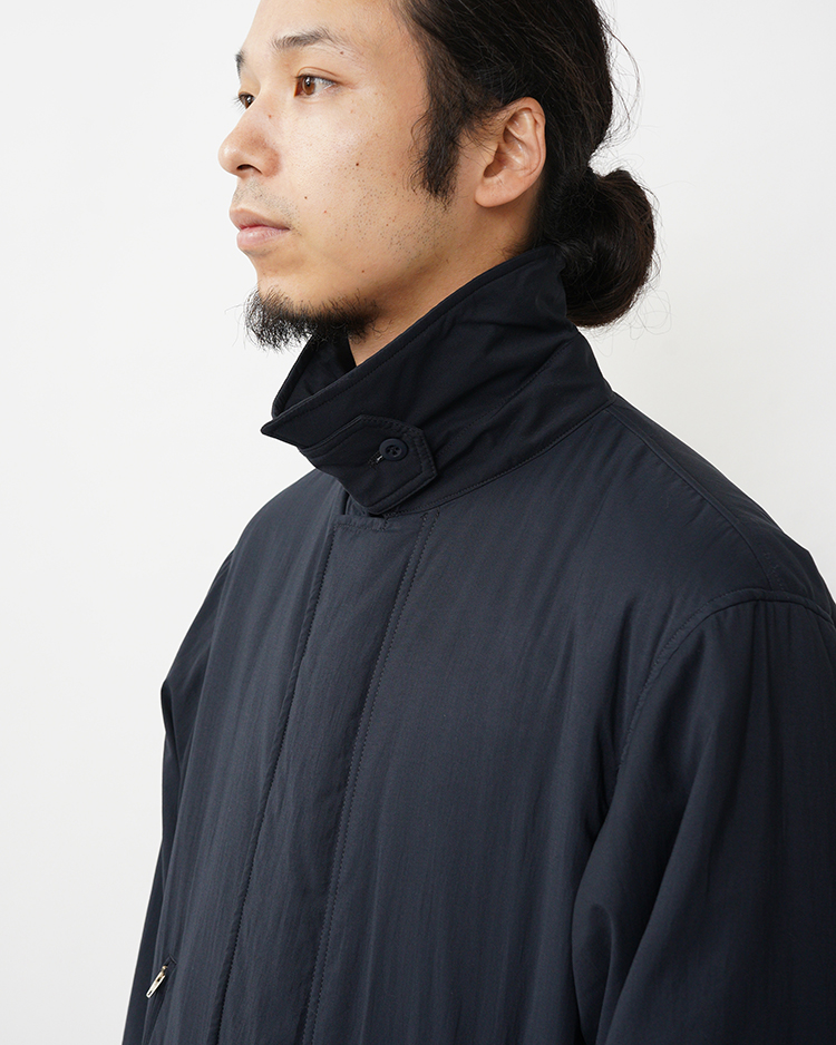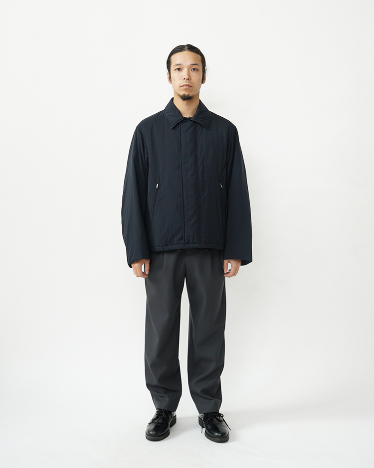 身幅に対して、着丈がやや短めの、スッキリとした佇まいが特徴のハリントンジャケット。裏地には高密度のナイロンタフタを使用し、軽い着心地と迫力あるシルエットを実現しています。また、中綿にはウールポリエステルを使用しています。